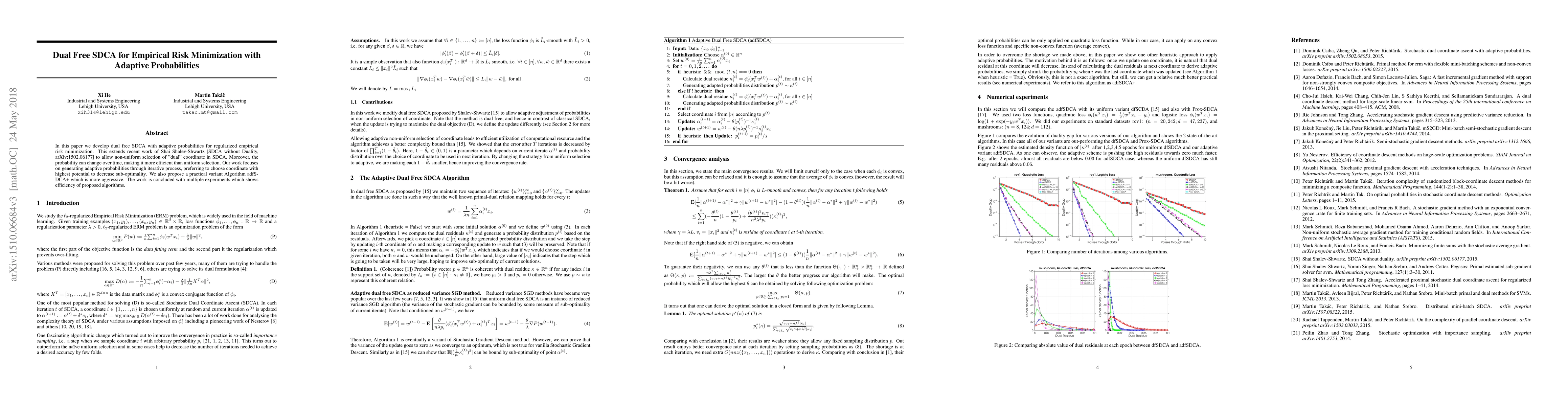 The paper develops a dual-free adaptive mini-batch SDCA for empirical risk minimization, allowing non-uniform selection of 'dual' coordinates with adaptive probabilities that can change over time.