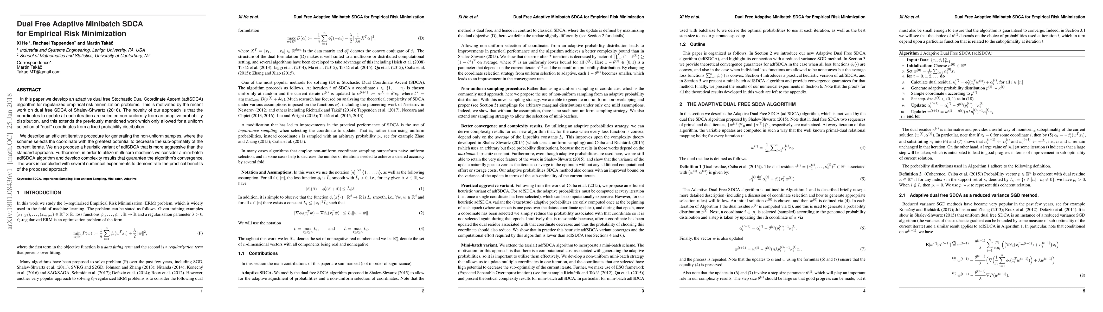 This paper introduces an adaptive dual-free Stochastic Dual Coordinate Ascent (adfSDCA) algorithm for solving regularized empirical risk minimization problems. It selects non-uniform coordinates for updates based on their potential to improve the current iterate, contrasting with uniform selection methods. The authors also propose a mini-batch variant and heuristics for enhanced performance, supported by numerical experiments.