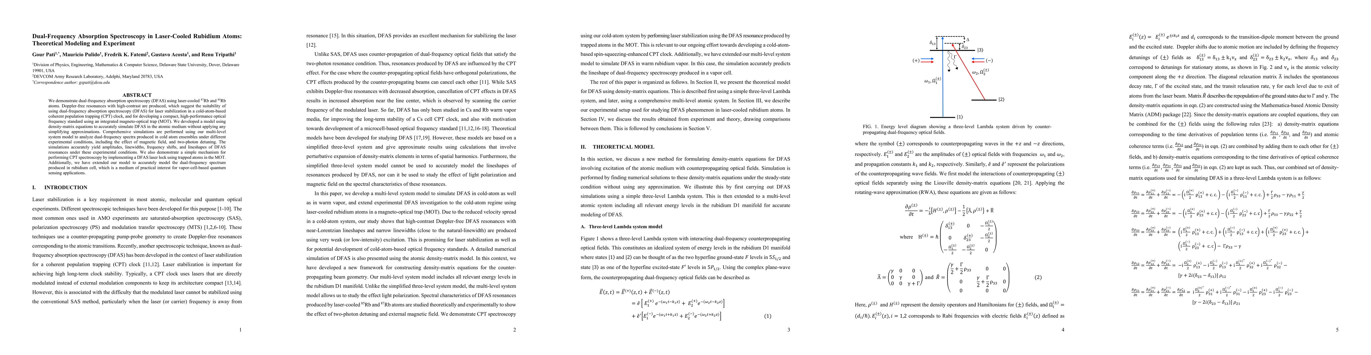 We demonstrate dual-frequency absorption spectroscopy (DFAS) using laser-cooled 87Rb and 85Rb atoms. Doppler-free resonances with high-contrast are produced, which suggest the suitability of using dual-frequency absorption spectroscopy (DFAS) for laser stabilization in a cold-atom-based coherent population trapping (CPT) clock, and for developing a compact, high-performance optical frequency standard using an integrated magneto-optical trap (MOT). We developed a model using density-matrix equations to accurately simulate DFAS in the atomic medium without applying any simplifying approximations. Comprehensive simulations are performed using our multi-level system model to analyze dual-frequency spectra produced in cold atom ensembles under different experimental conditions, including the effect of magnetic field, and two-photon detuning. The simulations accurately yield amplitudes, linewidths, frequency shifts, and lineshapes of DFAS resonances under these experimental conditions. We also demonstrate a simple mechanism for performing CPT spectroscopy by implementing a DFAS laser lock using trapped atoms in the MOT. Additionally, we have extended our model to accurately model the dual-frequency spectrum produced in rubidium cell, which is a medium of practical interest for vapor-cell-based quantum sensing applications.