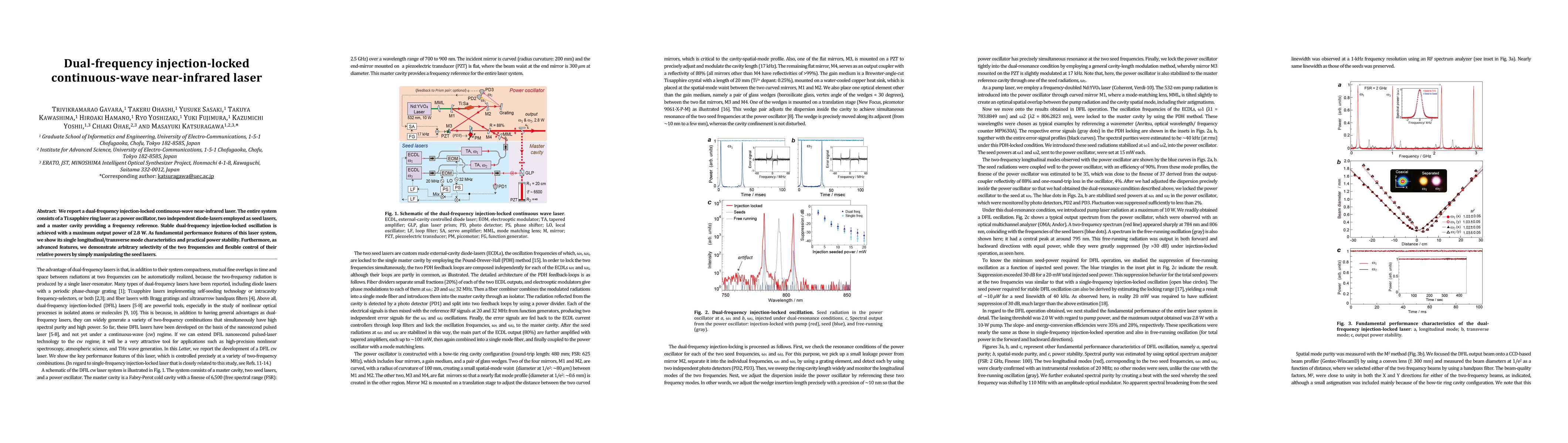 This research presents a dual-frequency injection-locked continuous-wave near-infrared laser using a Ti:sapphire ring laser and two independent diode-lasers, achieving stable operation with high output power and mode selectivity. The system allows for flexible control over the frequencies and their relative powers.