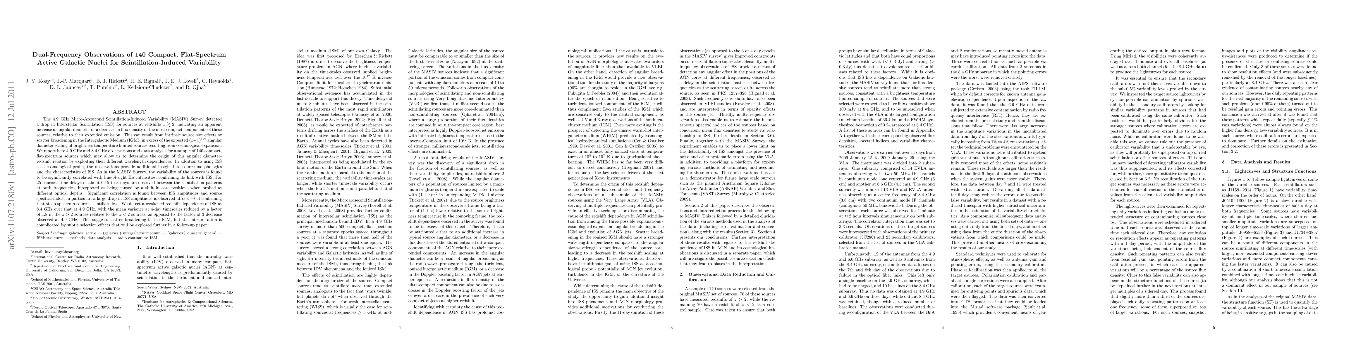 The 4.9 GHz Micro-Arcsecond Scintillation-Induced Variability (MASIV) Survey detected a drop in Interstellar Scintillation (ISS) for sources at redshifts z > 2, indicating an apparent increase in angular diameter or a decrease in flux density of the most compact components of these sources, relative to their extended emission. This can result from intrinsic source size effects or scatter broadening in the Intergalactic Medium (IGM), in excess of the expected (1+z)^0.5 angular diameter scaling of brightness temperature limited sources due to cosmological expansion. We report here 4.9 GHz and 8.4 GHz observations and data analysis for a sample of 140 compact, flat-spectrum sources which may allow us to determine the origin of this angular diameter-redshift relation by exploiting their different wavelength dependences. In addition to using ISS as a cosmological probe, the observations provide additional insight into source morphologies and the characteristics of ISS. As in the MASIV Survey, the variability of the sources is found to be significantly correlated with line-of-sight H-alpha intensities, confirming its link with ISS. For 25 sources, time delays of about 0.15 to 3 days are observed between the scintillation patterns at both frequencies, interpreted as being caused by a shift in core positions when probed at different optical depths. Significant correlation is found between ISS amplitudes and source spectral index; in particular, a large drop in ISS amplitudes is observed at spectral indices of < -0.4 confirming that steep spectrum sources scintillate less. We detect a weakened redshift dependence of ISS at 8.4 GHz over that at 4.9 GHz, with the mean variance at 4-day timescales reduced by a factor of 1.8 in the z > 2 sources relative to the z < 2 sources, as opposed to the factor of 3 decrease observed at 4.9 GHz. This suggests scatter broadening in the IGM.