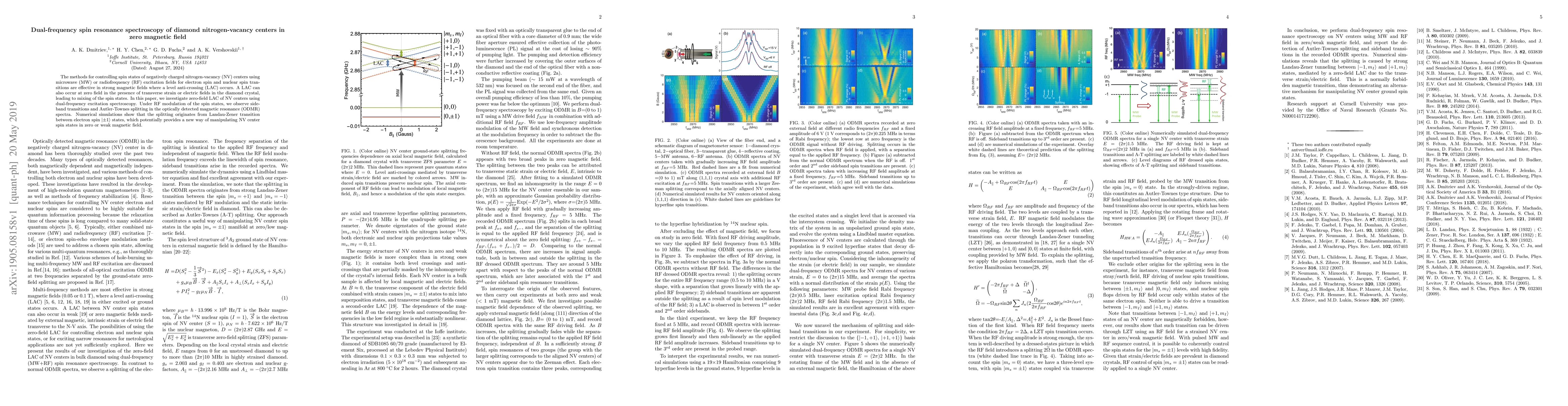 This paper investigates zero-field level anti-crossing (LAC) of nitrogen-vacancy (NV) centers in diamond using dual-frequency excitation spectroscopy, revealing sideband transitions and Autler-Townes splitting in optically detected magnetic resonance (ODMR) spectra. Numerical simulations attribute the splitting to Landau-Zener transitions, offering a novel method for manipulating NV center spin states in zero or weak magnetic fields.