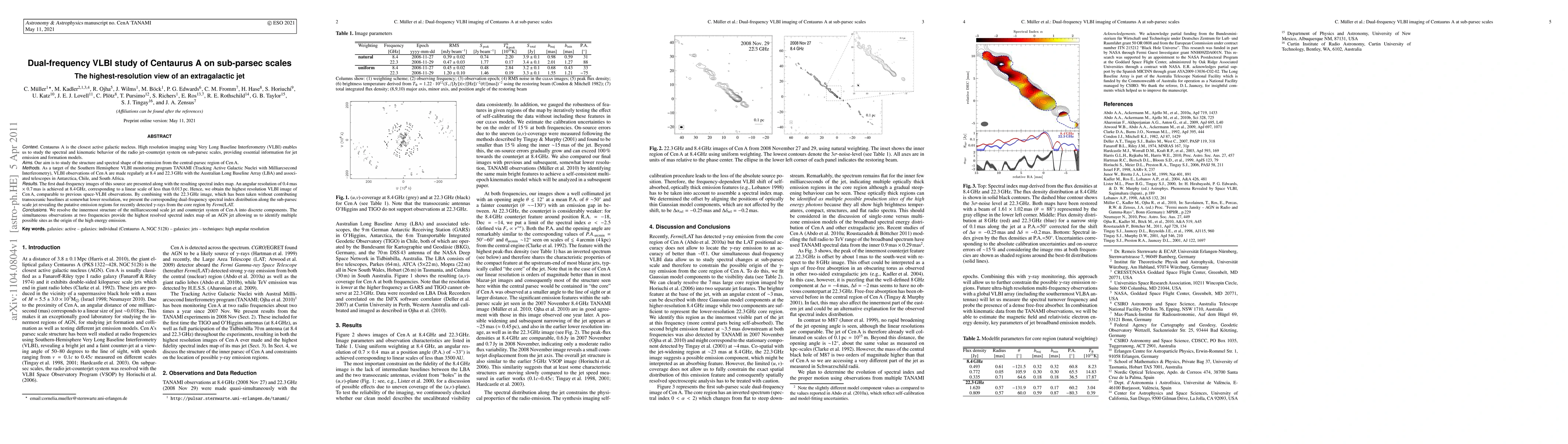 This study uses dual-frequency VLBI to achieve high-resolution imaging of Centaurus A's radio jet-counterjet system, revealing discrete components and providing a detailed spectral index map. The observations at 8.4 and 22.3 GHz identify potential gamma-ray emission sites, enhancing models of jet formation and emission.