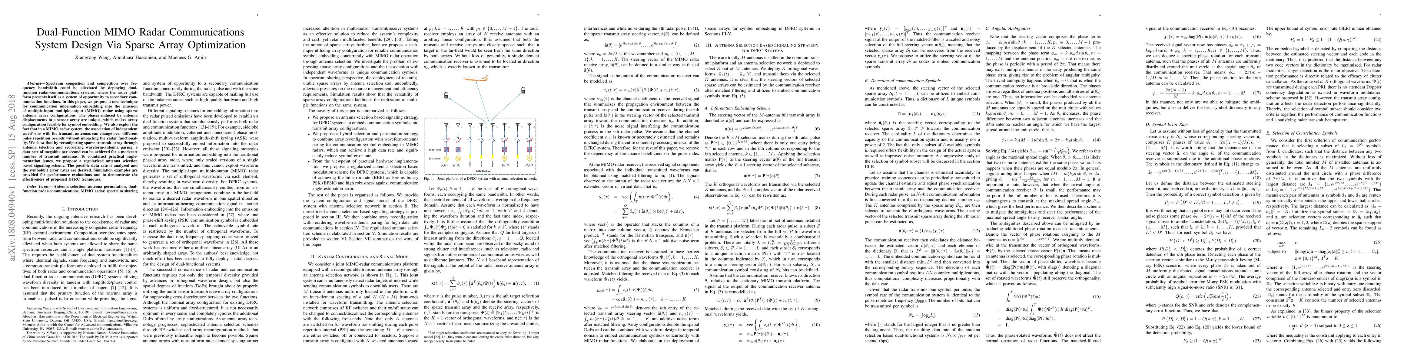 This paper proposes a dual-function radar-communication system using sparse MIMO radar arrays to embed communication information into radar emissions, achieving high data rates through antenna selection and waveform-antenna pairing. The study also introduces a regularized antenna selection scheme to address practical implementation issues, with simulations demonstrating the effectiveness of the proposed technique.