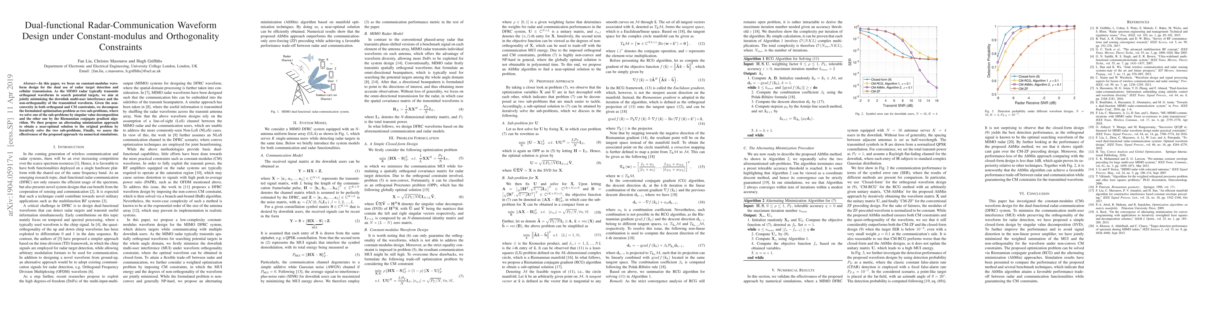 This paper designs dual-functional radar-communication waveforms under constant-modulus and orthogonality constraints, aiming to minimize interference and non-orthogonality. It employs an alternating minimization approach combining singular value decomposition and Riemannian conjugate gradient for near-optimal solutions, validated through simulations.