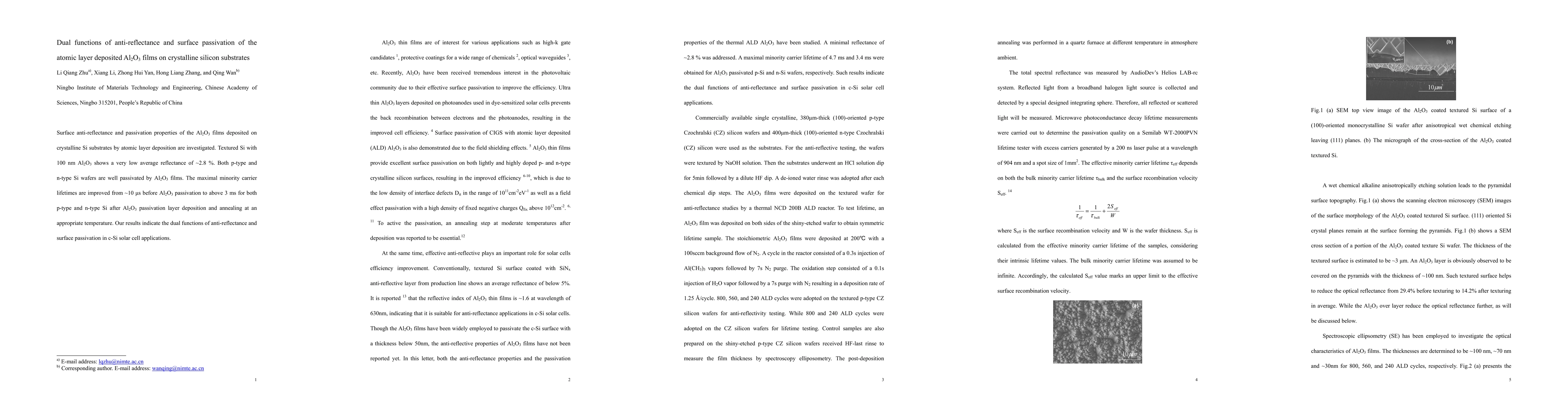 This paper investigates Al2O3 films deposited on crystalline silicon via atomic layer deposition, demonstrating their dual functions of anti-reflectance and surface passivation. The textured Si with 100 nm Al2O3 exhibits a low average reflectance of ~2.8%, and both p-type and n-type Si wafers show improved minority carrier lifetimes, enhancing solar cell performance.