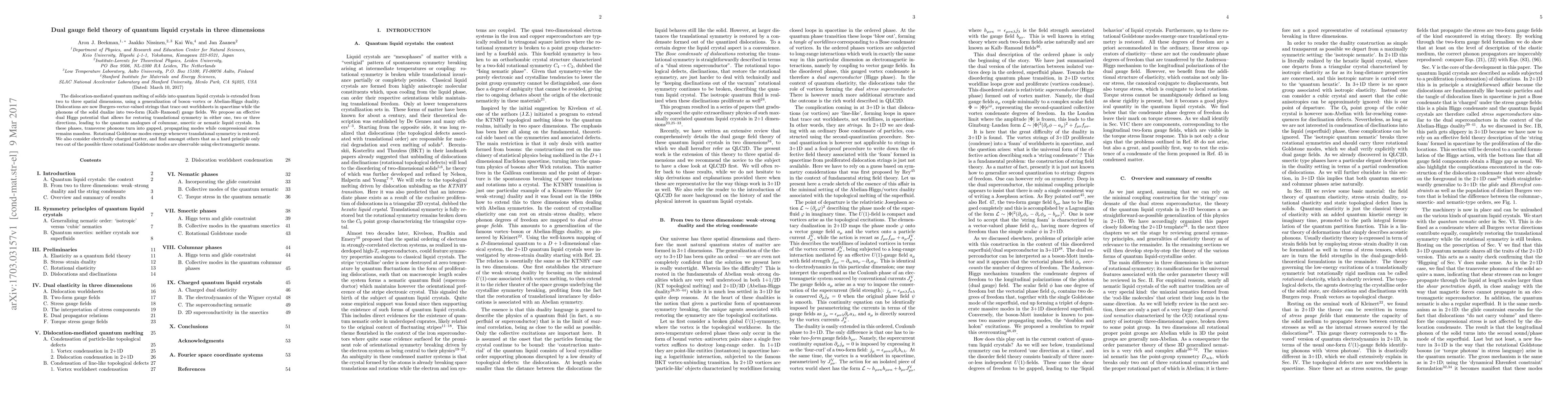This paper extends the quantum melting of solids into liquid crystals from two to three dimensions using boson-vortex duality, proposing an effective dual Higgs potential that restores translational symmetry in various directions, resulting in quantum analogues of columnar, smectic, or nematic phases. It also discusses the observability of rotational Goldstone modes in electrically charged matter.