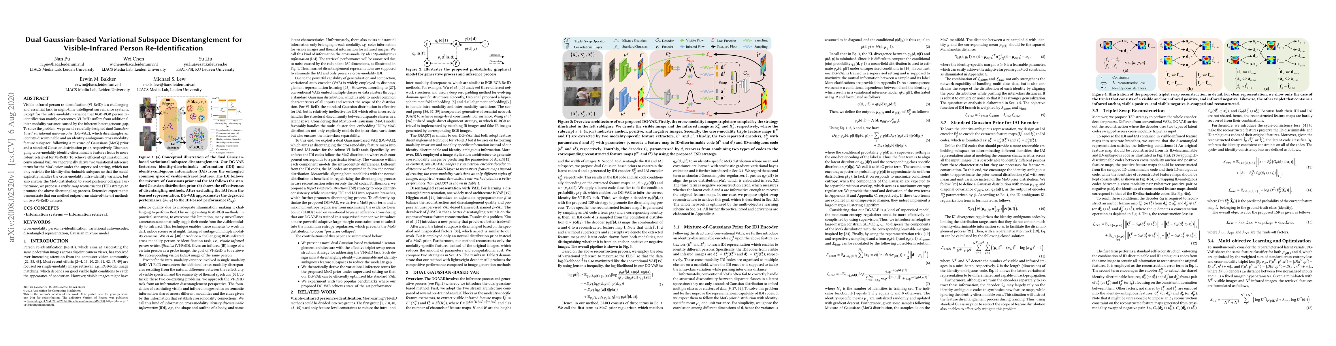 This paper proposes a dual Gaussian-based variational auto-encoder (DG-VAE) to disentangle cross-modality features for visible-infrared person re-identification, addressing inter-modality variance. The method outperforms state-of-the-art methods on VI-ReID datasets by effectively separating identity-discriminable and ambiguous features.