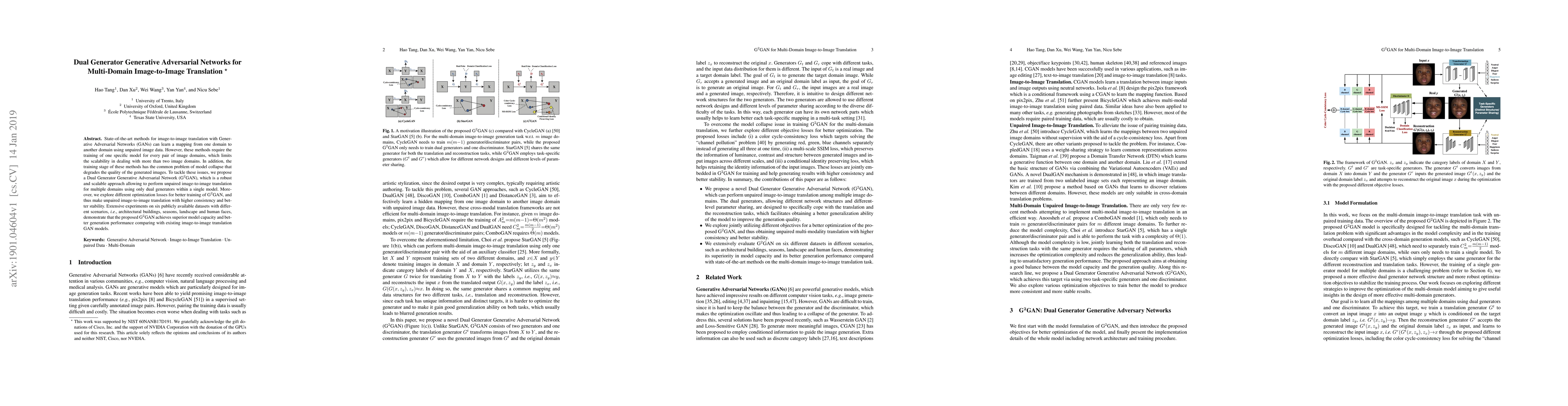 The paper proposes a Dual Generator Generative Adversarial Network (G$^2$GAN) for scalable, unpaired image-to-image translation across multiple domains, addressing model collapse and improving translation consistency and stability. Experiments show G$^2$GAN outperforms existing methods on various datasets.
