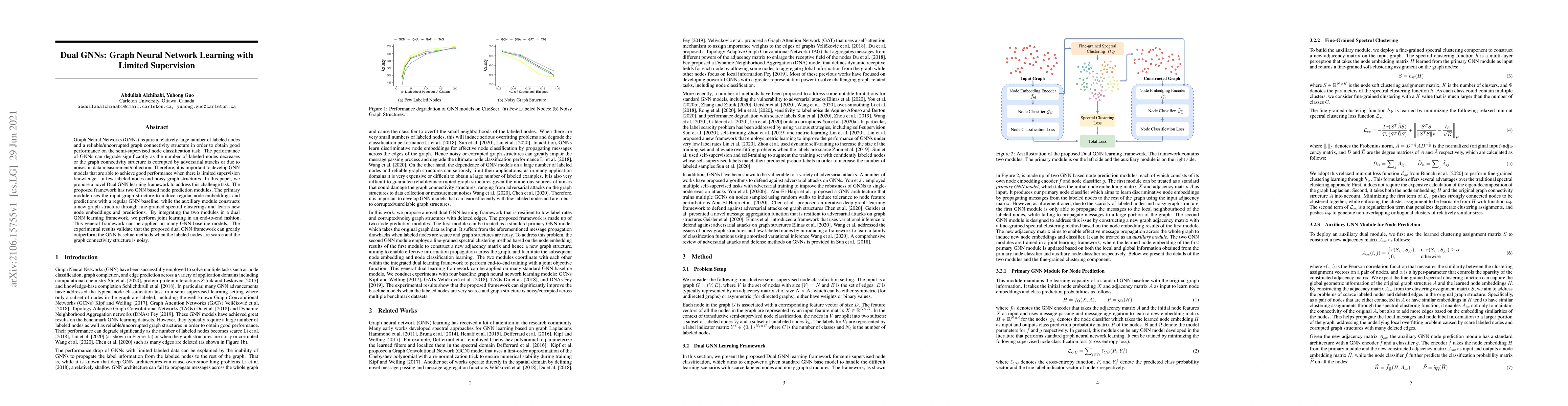 This paper proposes a Dual GNN framework with two modules to improve performance under limited supervision. The primary module uses a regular GNN, while the auxiliary module refines graph structures via spectral clustering. Experimental results show significant improvements over baseline GNNs in scenarios with few labeled nodes and noisy graph structures.