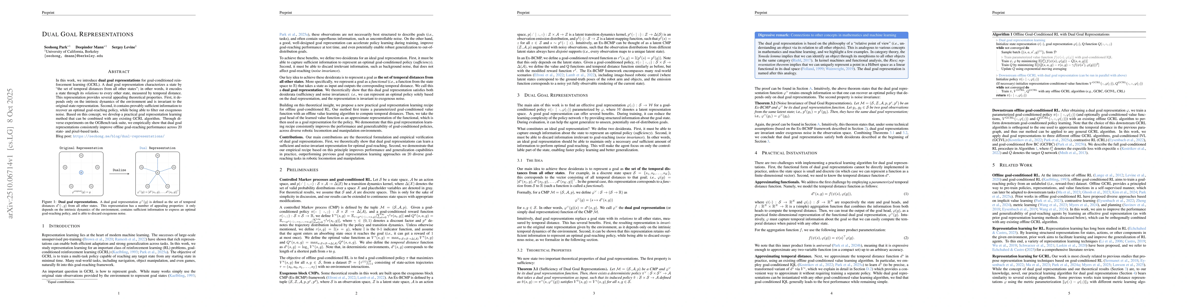 This work introduces a dual representation approach that simultaneously captures both state and goal information through a unified framework, differing from previous methods that typically focus on either state or goal representations separately.