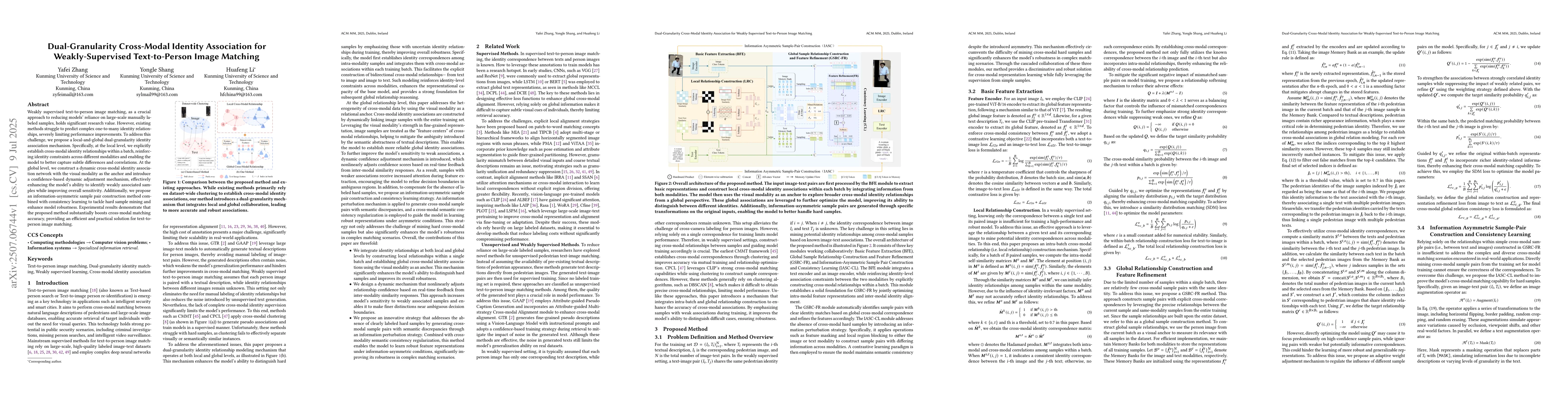 Weakly supervised text-to-person image matching, as a crucial approach to reducing models' reliance on large-scale manually labeled samples, holds significant research value. However, existing methods struggle to predict complex one-to-many identity relationships, severely limiting performance improvements. To address this challenge, we propose a local-and-global dual-granularity identity association mechanism. Specifically, at the local level, we explicitly establish cross-modal identity relationships within a batch, reinforcing identity constraints across different modalities and enabling the model to better capture subtle differences and correlations. At the global level, we construct a dynamic cross-modal identity association network with the visual modality as the anchor and introduce a confidence-based dynamic adjustment mechanism, effectively enhancing the model's ability to identify weakly associated samples while improving overall sensitivity. Additionally, we propose an information-asymmetric sample pair construction method combined with consistency learning to tackle hard sample mining and enhance model robustness. Experimental results demonstrate that the proposed method substantially boosts cross-modal matching accuracy, providing an efficient and practical solution for text-to-person image matching.