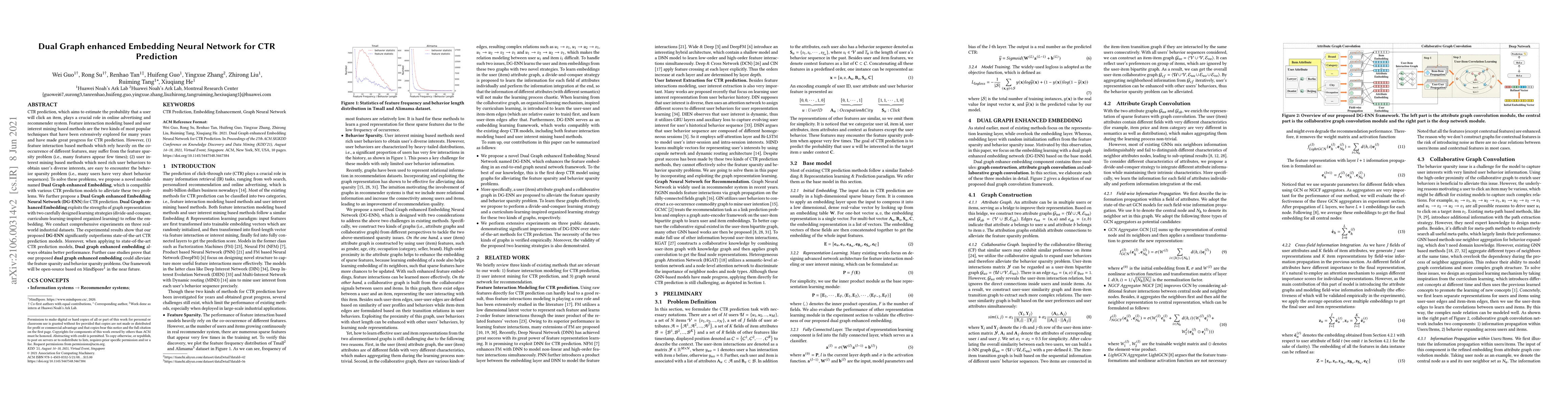 The paper proposes a Dual Graph enhanced Embedding Neural Network (DG-ENN) for Click-Through Rate (CTR) prediction, addressing feature and behavior sparsity issues through a novel Dual Graph enhanced Embedding module. Experimental results show that DG-ENN outperforms state-of-the-art models and alleviates sparsity problems, with plans to release the framework open-source.
