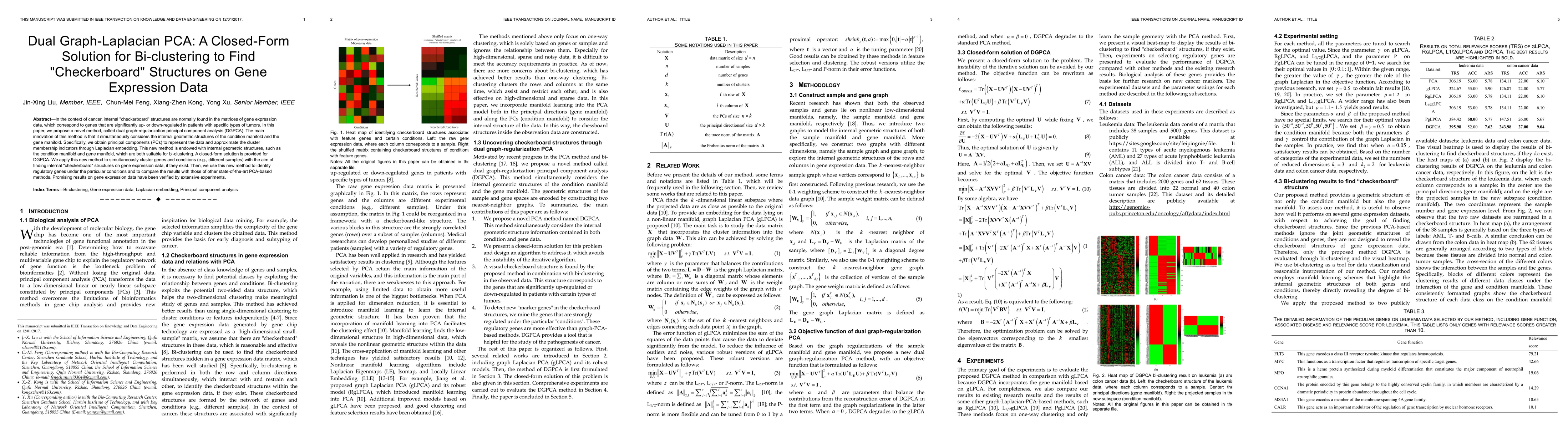 This paper introduces DGPCA, a novel method for bi-clustering gene expression data to identify "checkerboard" structures in cancer patients. It simultaneously considers the geometric structures of both condition and gene manifolds, providing a closed-form solution for effective bi-clustering and regulatory gene identification.