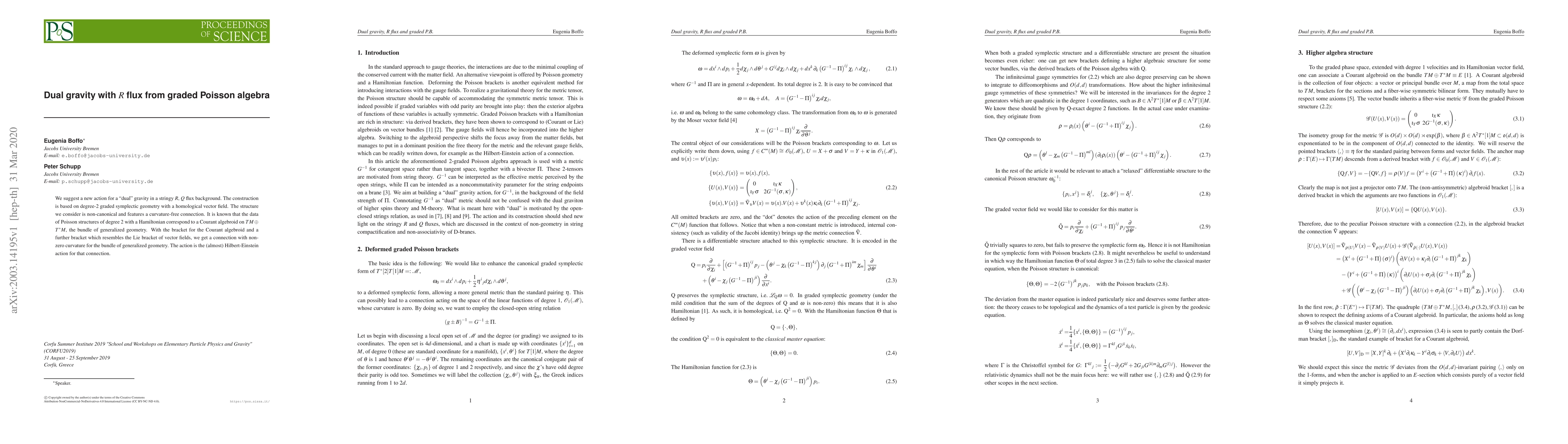 We suggest a new action for a ``dual'' gravity in a stringy $R$, $Q$ flux background. The construction is based on degree-$2$ graded symplectic geometry with a homological vector field. The structure we consider is non-canonical and features a curvature-free connection. It is known that the data of Poisson structures of degree $2$ with a Hamiltonian correspond to a Courant algebroid on $TM \oplus T^{*}M$, the bundle of generalized geometry. With the bracket for the Courant algebroid and a further bracket which resembles the Lie bracket of vector fields, we get a connection with non-zero curvature for the bundle of generalized geometry. The action is the (almost) Hilbert-Einstein action for that connection.