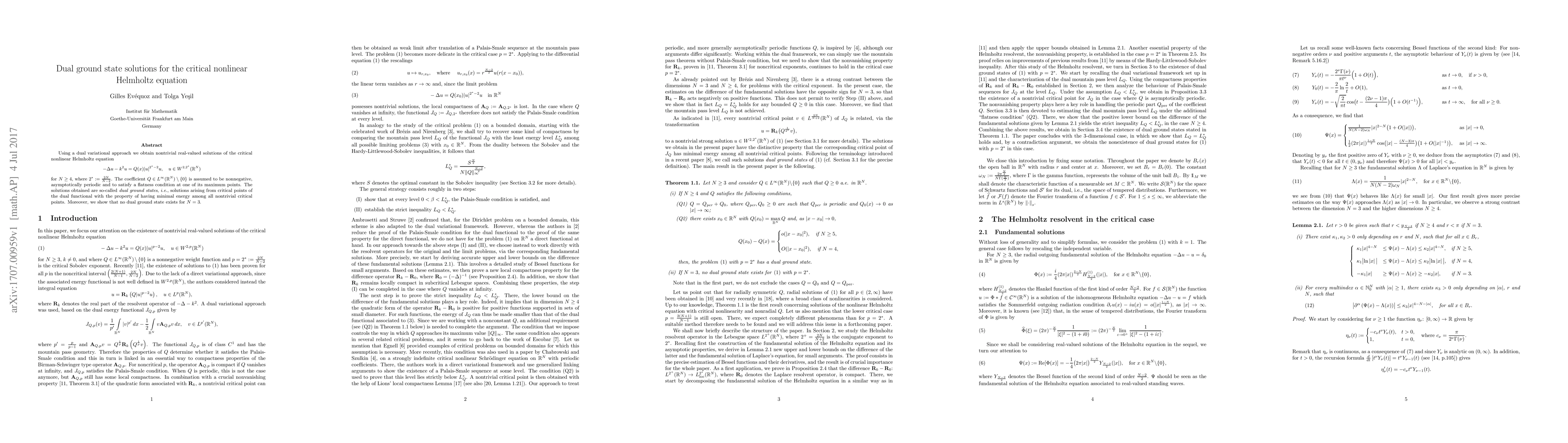 This paper uses a dual variational method to find nontrivial real-valued solutions for the critical nonlinear Helmholtz equation in dimensions $N \geq 4$. The obtained dual ground state solutions have minimal energy among all nontrivial critical points, but no such solutions exist for $N=3$.