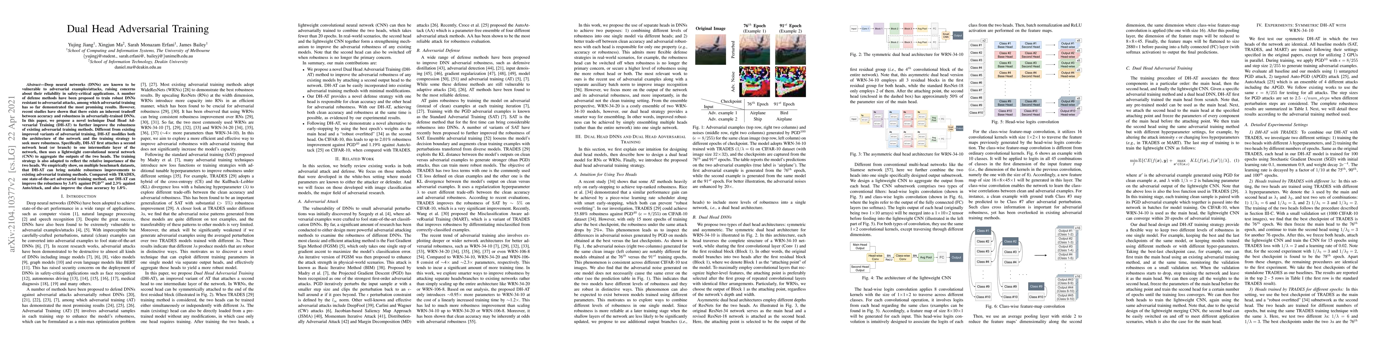 This paper introduces Dual Head Adversarial Training (DH-AT) to enhance the robustness of deep neural networks against adversarial attacks. DH-AT adds a second network head and employs a lightweight CNN to aggregate their outputs, improving both robustness and clean accuracy over existing adversarial training methods.