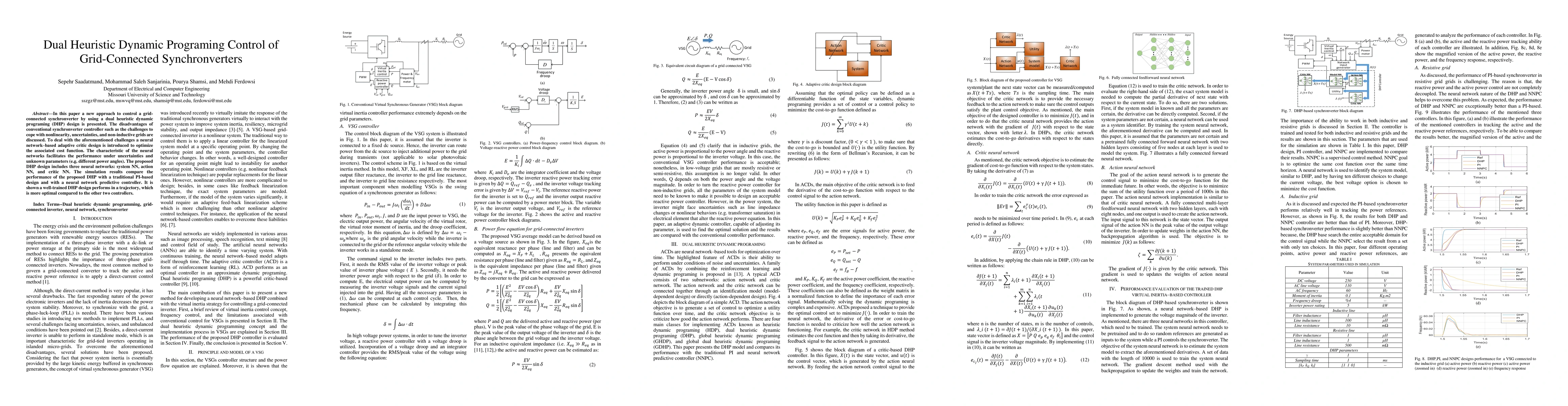 In this paper a new approach to control a grid-connected synchronverter by using a dual heuristic dynamic programing (DHP) design is presented. The disadvantages of conventional synchronverter controller such as the challenges to cope with nonlinearity, uncertainties, and non-inductive grids are discussed.To deal with the aforementioned challenges a neural network based adaptive critic design is introduced to optimize the associated cost function. The characteristic of the neural networks facilitates the performance under uncertainties and unknown parameters (for example different power angles). The proposed DHP design includes three neural networks: system NN, action NN, and critic NN. The simulation results compare the performance of the proposed DHP with a traditional PI-based design and with a neural network predictive controller. It is shown a well trained DHP design performs in a trajectory, which is more optimal compared to the other two controllers.