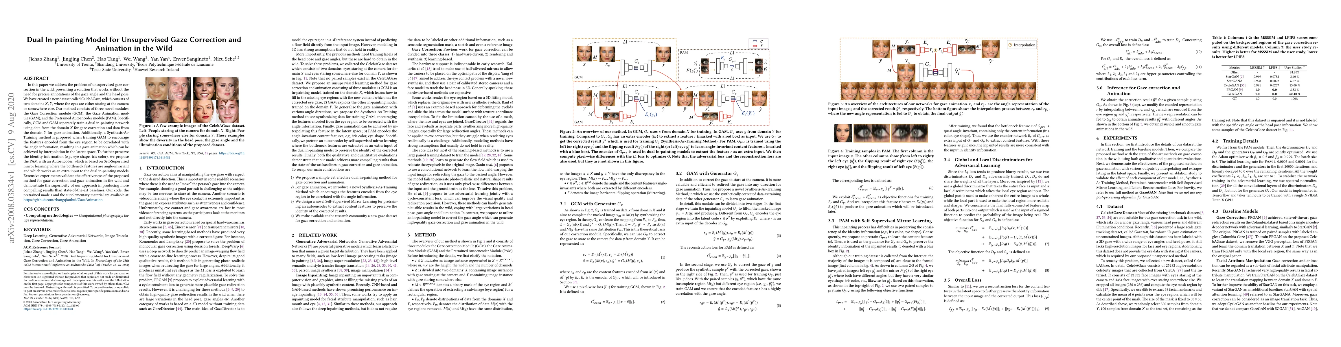 This paper introduces a dual in-painting model for unsupervised gaze correction and animation without precise annotations. It employs three novel modules: Gaze Correction, Gaze Animation, and a Pretrained Autoencoder, achieving superior results in gaze correction and animation compared to baselines.