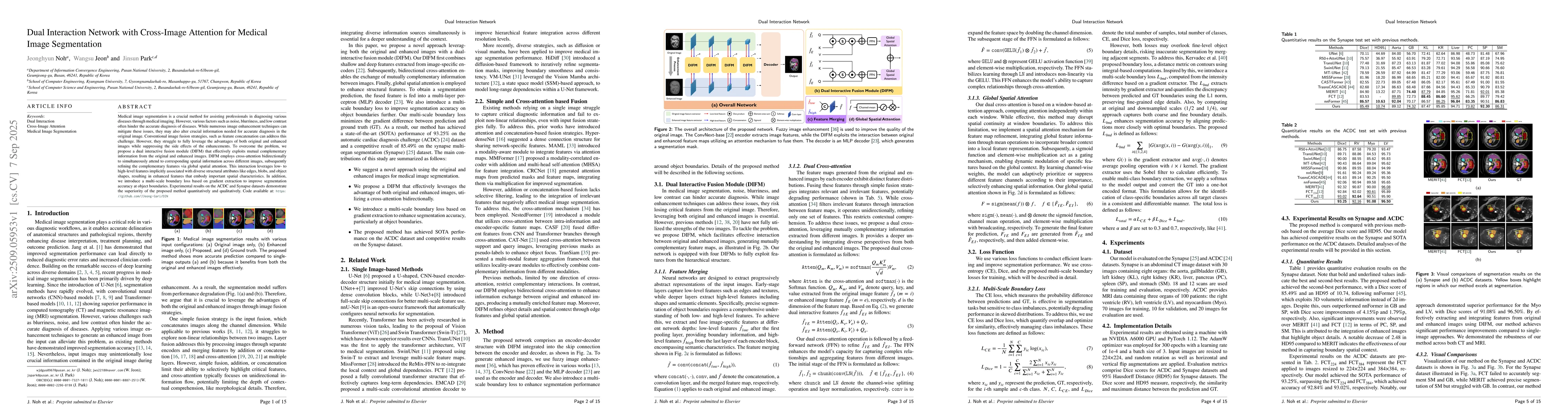 Medical image segmentation is a crucial method for assisting professionals in diagnosing various diseases through medical imaging. However, various factors such as noise, blurriness, and low contrast often hinder the accurate diagnosis of diseases. While numerous image enhancement techniques can mitigate these issues, they may also alter crucial information needed for accurate diagnosis in the original image. Conventional image fusion strategies, such as feature concatenation can address this challenge. However, they struggle to fully leverage the advantages of both original and enhanced images while suppressing the side effects of the enhancements. To overcome the problem, we propose a dual interactive fusion module (DIFM) that effectively exploits mutual complementary information from the original and enhanced images. DIFM employs cross-attention bidirectionally to simultaneously attend to corresponding spatial information across different images, subsequently refining the complementary features via global spatial attention. This interaction leverages low- to high-level features implicitly associated with diverse structural attributes like edges, blobs, and object shapes, resulting in enhanced features that embody important spatial characteristics. In addition, we introduce a multi-scale boundary loss based on gradient extraction to improve segmentation accuracy at object boundaries. Experimental results on the ACDC and Synapse datasets demonstrate the superiority of the proposed method quantitatively and qualitatively. Code available at: https://github.com/JJeong-Gari/DIN
