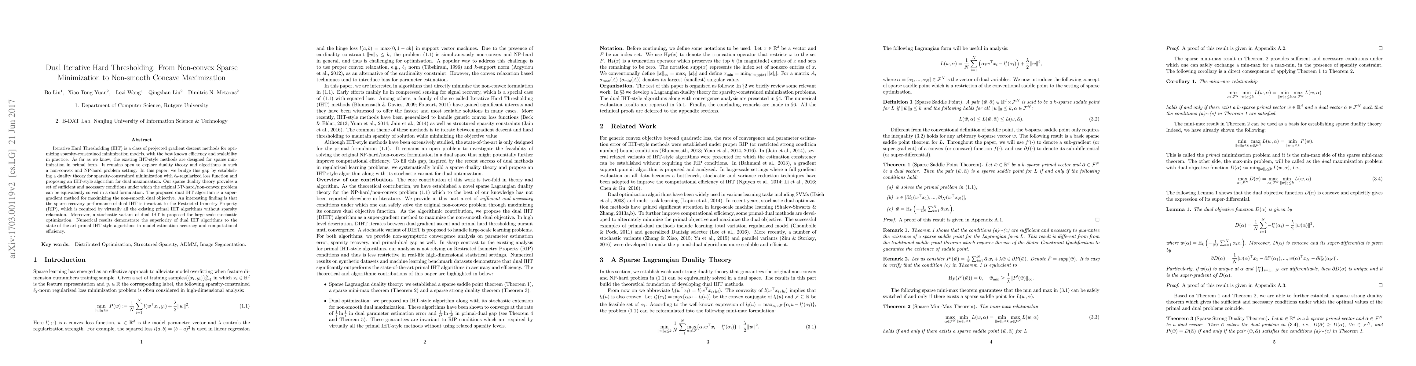 This paper introduces a dual iterative hard thresholding method for solving non-convex sparse minimization problems by leveraging duality theory. It proposes a super-gradient algorithm for maximizing the non-smooth dual objective, demonstrating superior performance in model estimation accuracy and computational efficiency compared to existing primal IHT-style algorithms.