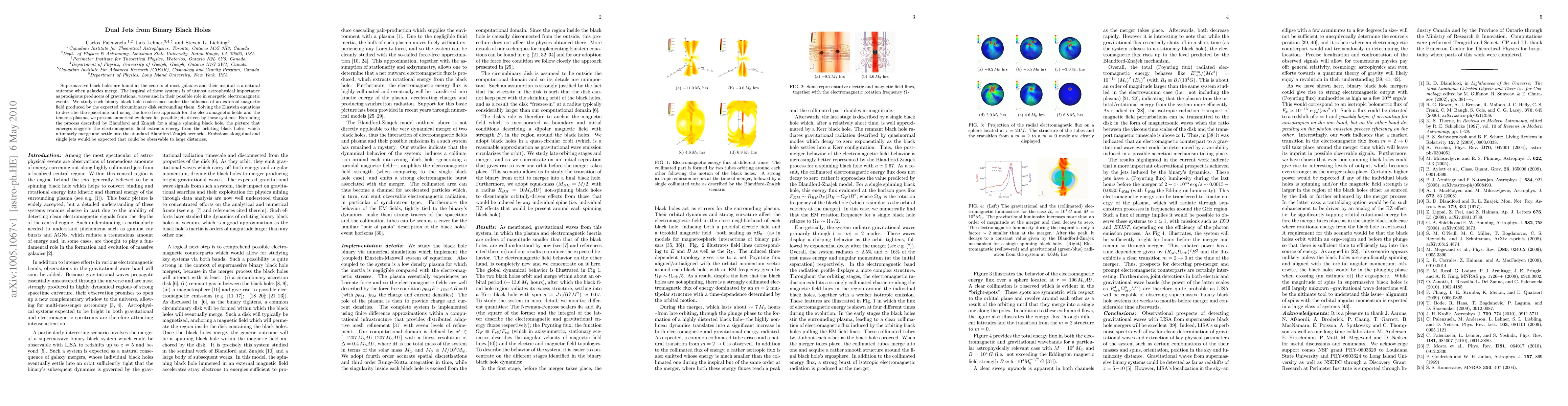 Supermassive black holes are found at the centers of most galaxies and their inspiral is a natural outcome when galaxies merge. The inspiral of these systems is of utmost astrophysical importance as prodigious producers of gravitational waves and in their possible role in energetic electromagnetic events. We study such binary black hole coalescence under the influence of an external magnetic field produced by the expected circumbinary disk surrounding them. Solving the Einstein equations to describe the spacetime and using the force-free approach for the electromagnetic fields and the tenuous plasma, we present numerical evidence for possible jets driven by these systems. Extending the process described by Blandford and Znajek for a single spinning black hole, the picture that emerges suggests the electromagnetic field extracts energy from the orbiting black holes, which ultimately merge and settle into the standard Blandford-Znajek scenario. Emissions along dual and single jets would be expected that could be observable to large distances.