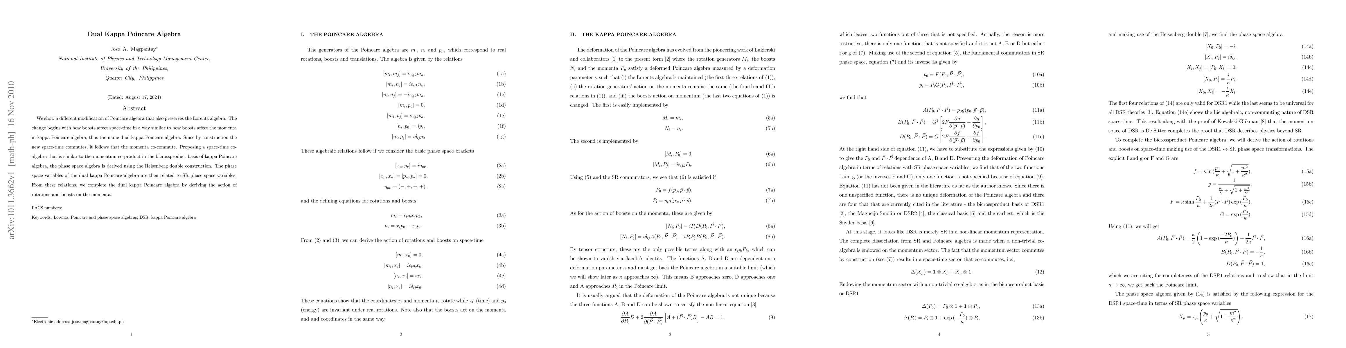 This paper introduces the dual kappa Poincare algebra, a modified version of the Poincare algebra that preserves the Lorentz algebra. It proposes a spacetime co-algebra and derives the phase space algebra using the Heisenberg double construction, relating it to special relativity phase space variables and completing the algebra with rotations and boosts.