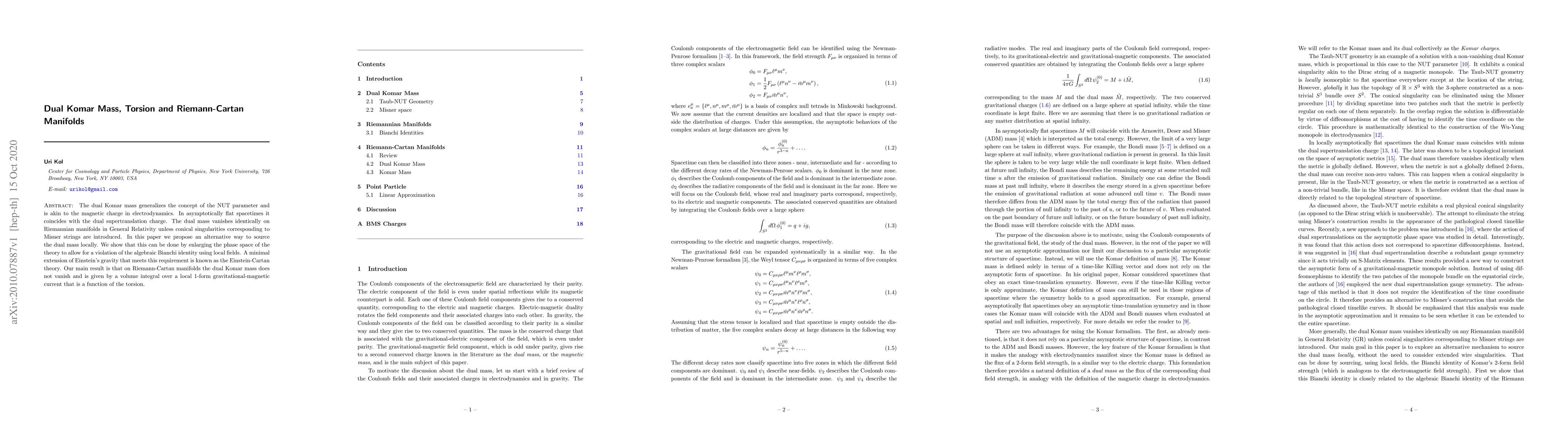 The dual Komar mass generalizes the concept of the NUT parameter and is akin to the magnetic charge in electrodynamics. In asymptotically flat spacetimes it coincides with the dual supertranslation charge. The dual mass vanishes identically on Riemannian manifolds in General Relativity unless conical singularities corresponding to Misner strings are introduced. In this paper we propose an alternative way to source the dual mass locally. We show that this can be done by enlarging the phase space of the theory to allow for a violation of the algebraic Bianchi identity using local fields. A minimal extension of Einstein's gravity that meets this requirement is known as the Einstein-Cartan theory. Our main result is that on Riemann-Cartan manifolds the dual Komar mass does not vanish and is given by a volume integral over a local 1-form gravitational-magnetic current that is a function of the torsion.