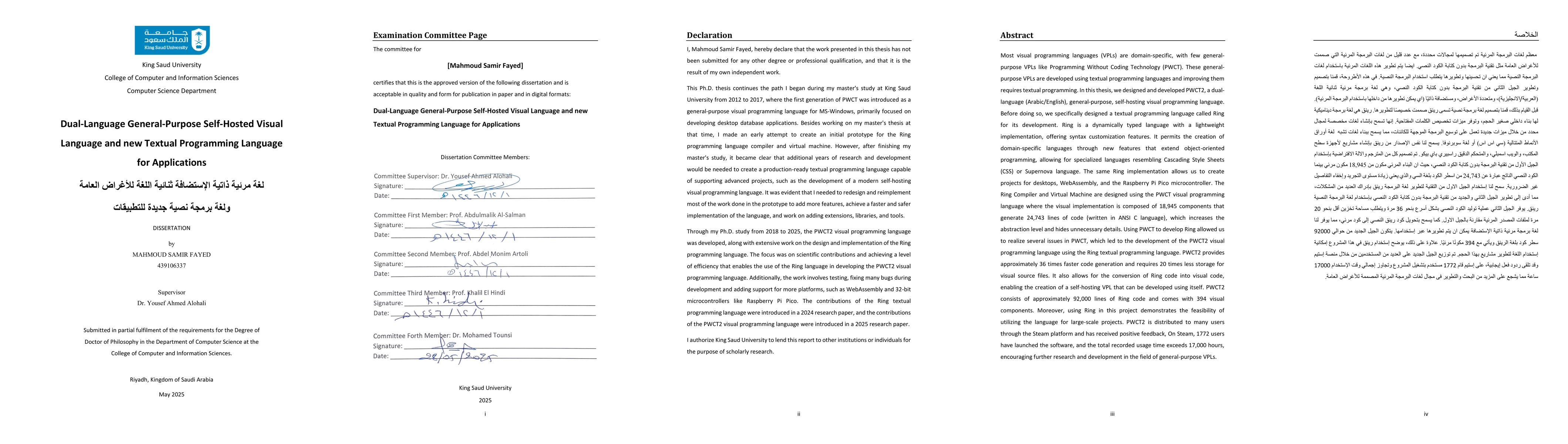 Most visual programming languages (VPLs) are domain-specific, with few general-purpose VPLs like Programming Without Coding Technology (PWCT). These general-purpose VPLs are developed using textual programming languages and improving them requires textual programming. In this thesis, we designed and developed PWCT2, a dual-language (Arabic/English), general-purpose, self-hosting visual programming language. Before doing so, we specifically designed a textual programming language called Ring for its development. Ring is a dynamically typed language with a lightweight implementation, offering syntax customization features. It permits the creation of domain-specific languages through new features that extend object-oriented programming, allowing for specialized languages resembling Cascading Style Sheets (CSS) or Supernova language. The Ring Compiler and Virtual Machine are designed using the PWCT visual programming language where the visual implementation is composed of 18,945 components that generate 24,743 lines of C code, which increases the abstraction level and hides unnecessary details. Using PWCT to develop Ring allowed us to realize several issues in PWCT, which led to the development of the PWCT2 visual programming language using the Ring textual programming language. PWCT2 provides approximately 36 times faster code generation and requires 20 times less storage for visual source files. It also allows for the conversion of Ring code into visual code, enabling the creation of a self-hosting VPL that can be developed using itself. PWCT2 consists of approximately 92,000 lines of Ring code and comes with 394 visual components. PWCT2 is distributed to many users through the Steam platform and has received positive feedback, On Steam, 1772 users have launched the software, and the total recorded usage time exceeds 17,000 hours, encouraging further research and development.