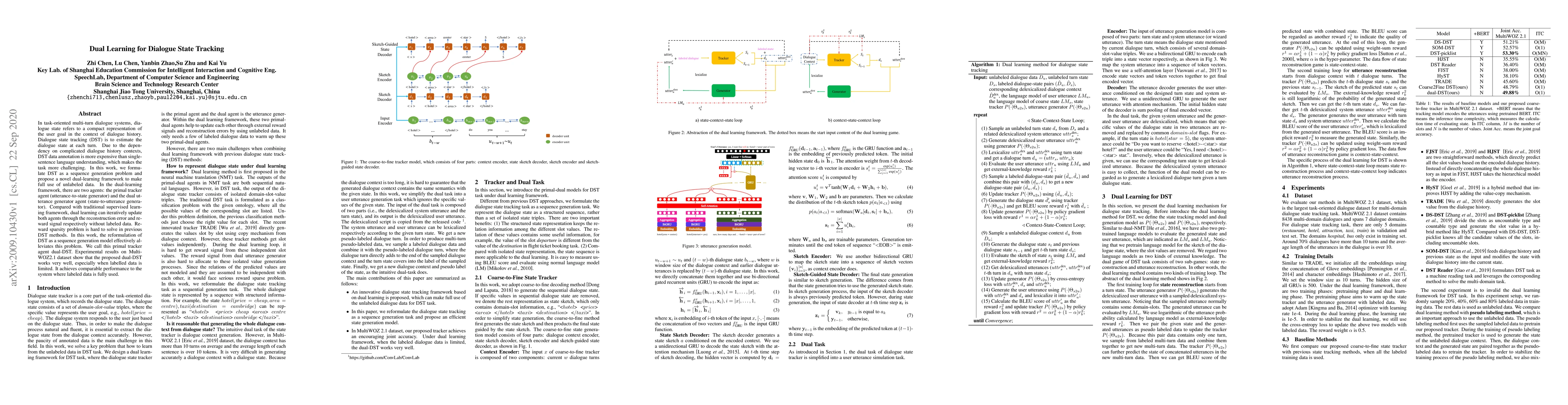 This paper proposes a dual-learning framework for dialogue state tracking (DST) in task-oriented dialogue systems, utilizing both a primal tracker agent and a dual utterance generator to iteratively update without labeled data. Experimental results show that the method, named dual-DST, performs well even with limited labeled data, achieving comparable results to fully supervised systems.