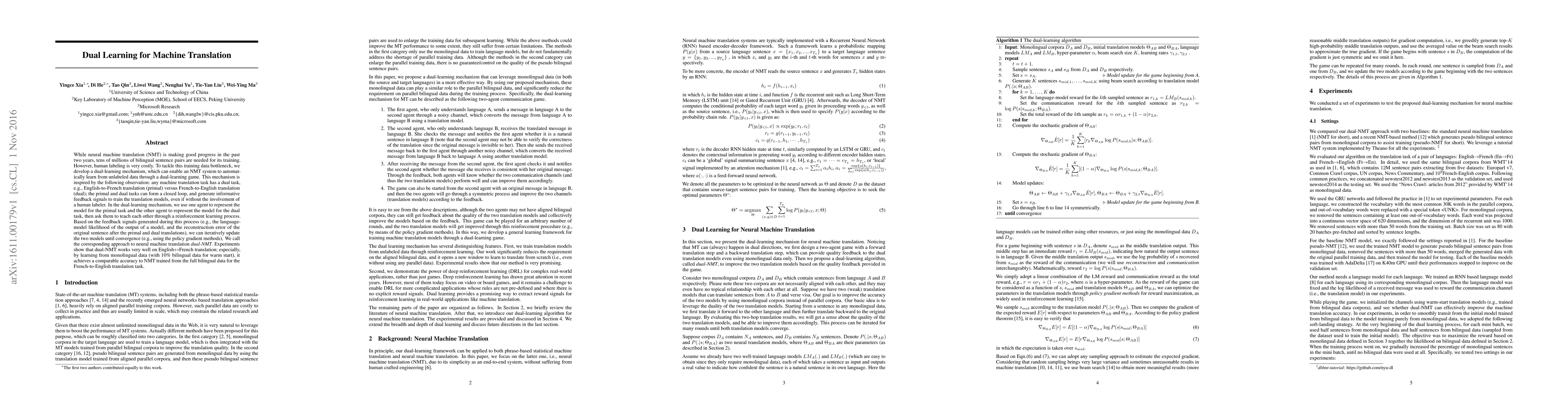 The paper proposes a dual-learning mechanism called dual-NMT to address the data bottleneck in neural machine translation (NMT), enabling the system to learn from unlabeled data through a dual-learning game between the primal and dual translation tasks. Experiments demonstrate that dual-NMT achieves comparable accuracy to NMT trained on full bilingual data, especially when starting with minimal bilingual data and leveraging monolingual data.