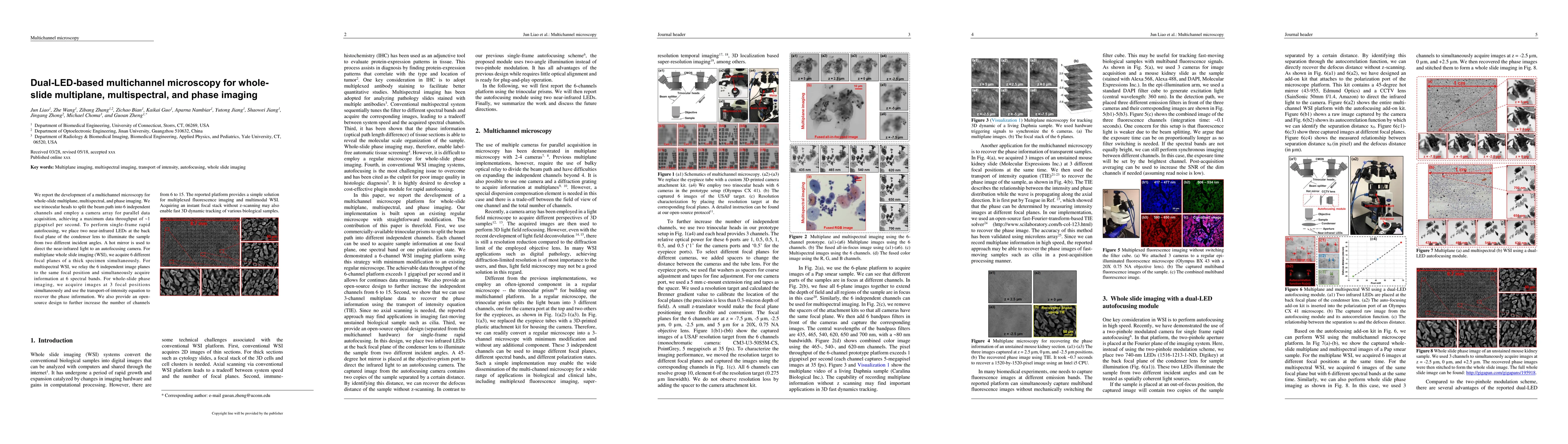 This paper introduces a dual-LED-based multichannel microscopy system capable of whole-slide multiplane, multispectral, and phase imaging through parallel data acquisition. The platform uses trinocular heads and a camera array to achieve high data throughput and employs near-infrared LEDs for rapid autofocusing.