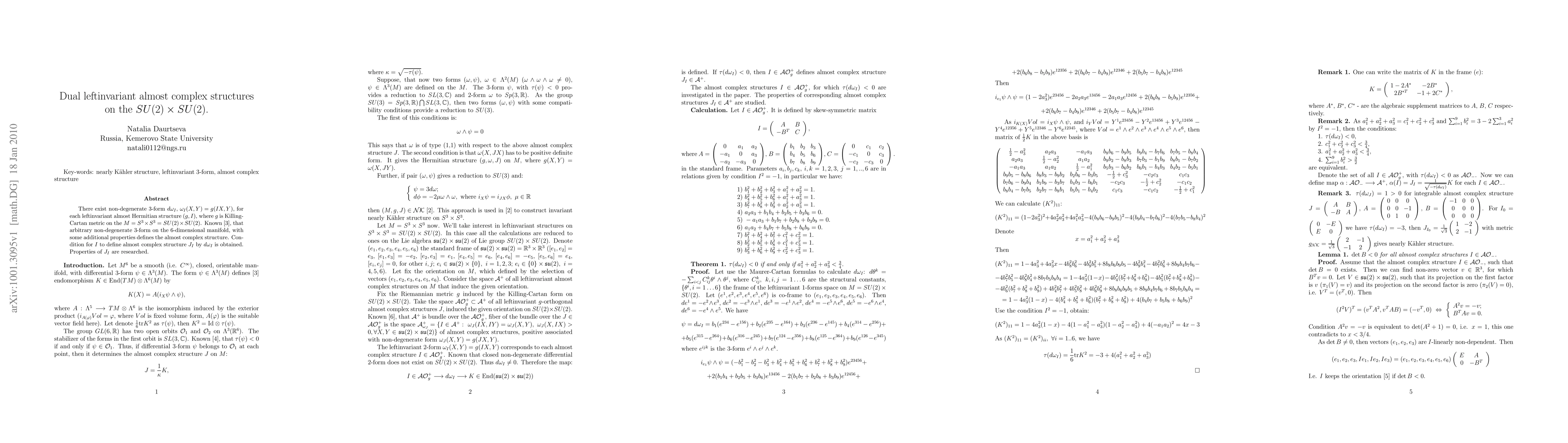 There exist non-degenerate 3-form $d\omega_I$, $\omega_I(X,Y)=g(IX,Y)$, for each leftinvariant almost Hermitian structure $(g,I)$, where $g$ is Killing-Cartan metric on the $M=S^3\times S^3=SU(2)\times SU(2)$. Known \cite{H1}, that arbitrary non-degenerate 3-form on the 6-dimensional manifold, with some additional properties defines the almost complex structure. Condition for $I$ to define almost complex structure $J_I$ by $d\omega_I$ is obtained. Properties of $J_I$ are researched.