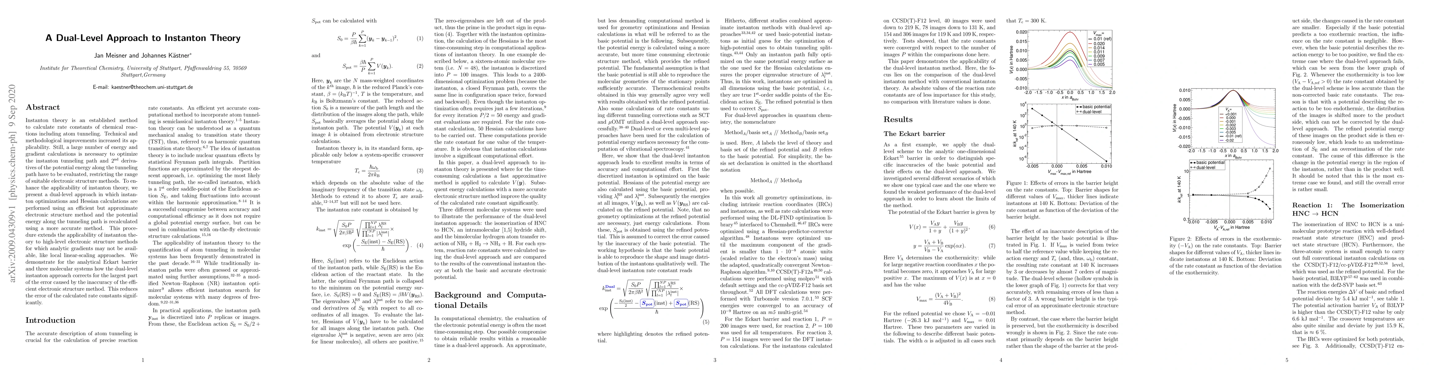 The paper proposes a dual-level approach to instanton theory that optimizes tunneling paths using an efficient method while recalculating potential energy with a more accurate one, thus extending its applicability to high-level electronic structure methods. This method significantly reduces the error in calculated rate constants for various molecular systems.
