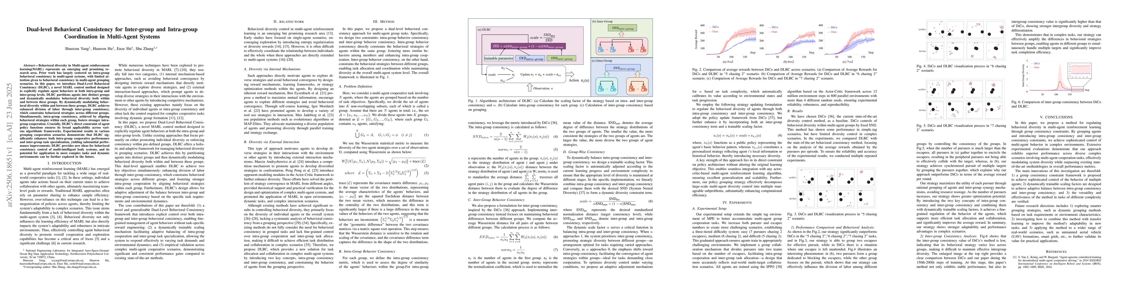 Behavioral diversity in Multi-agent reinforcement learning(MARL) represents an emerging and promising research area. Prior work has largely centered on intra-group behavioral consistency in multi-agent systems, with limited attention given to behavioral consistency in multi-agent grouping scenarios. In this paper, we introduce Dual-Level Behavioral Consistency (DLBC), a novel MARL control method designed to explicitly regulate agent behaviors at both intra-group and inter-group levels. DLBC partitions agents into distinct groups and dynamically modulates behavioral diversity both within and between these groups. By dynamically modulating behavioral diversity within and between these groups, DLBC achieves enhanced division of labor through inter-group consistency, which constrains behavioral strategies across different groups. Simultaneously, intra-group consistency, achieved by aligning behavioral strategies within each group, fosters stronger intra-group cooperation. Crucially, DLBC's direct constraint of agent policy functions ensures its broad applicability across various algorithmic frameworks. Experimental results in various grouping cooperation scenarios demonstrate that DLBC significantly enhances both intra-group cooperative performance and inter-group task specialization, yielding substantial performance improvements. DLBC provides new ideas for behavioral consistency control of multi-intelligent body systems, and its potential for application in more complex tasks and dynamic environments can be further explored in the future.