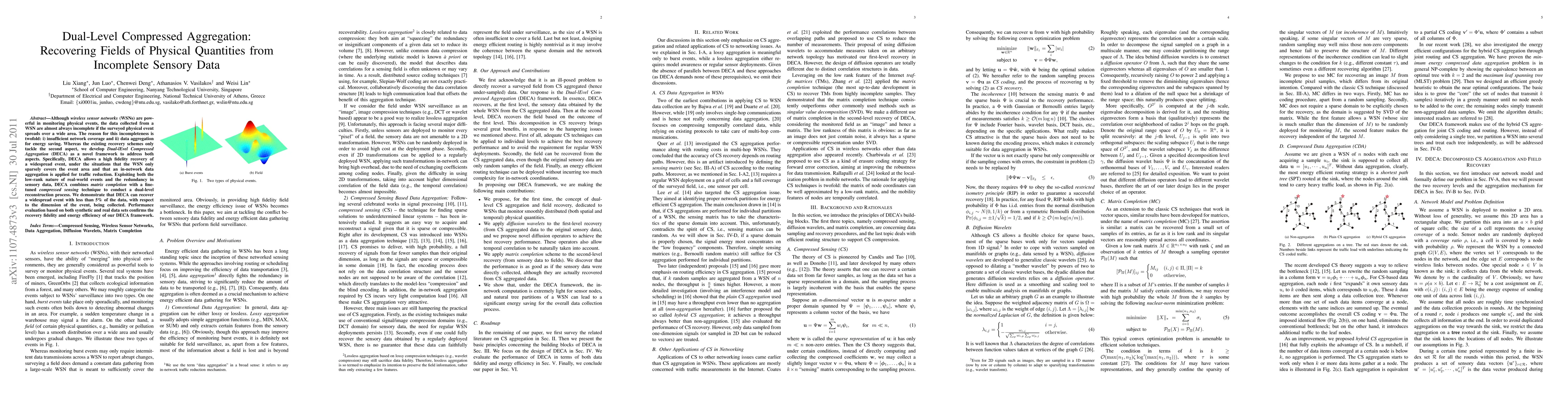 Although wireless sensor networks (WSNs) are powerful in monitoring physical events, the data collected from a WSN are almost always incomplete if the surveyed physical event spreads over a wide area. The reason for this incompleteness is twofold: i) insufficient network coverage and ii) data aggregation for energy saving. Whereas the existing recovery schemes only tackle the second aspect, we develop Dual-lEvel Compressed Aggregation (DECA) as a novel framework to address both aspects. Specifically, DECA allows a high fidelity recovery of a widespread event, under the situations that the WSN only sparsely covers the event area and that an in-network data aggregation is applied for traffic reduction. Exploiting both the low-rank nature of real-world events and the redundancy in sensory data, DECA combines matrix completion with a fine-tuned compressed sensing technique to conduct a dual-level reconstruction process. We demonstrate that DECA can recover a widespread event with less than 5% of the data, with respect to the dimension of the event, being collected. Performance evaluation based on both synthetic and real data sets confirms the recovery fidelity and energy efficiency of our DECA framework.