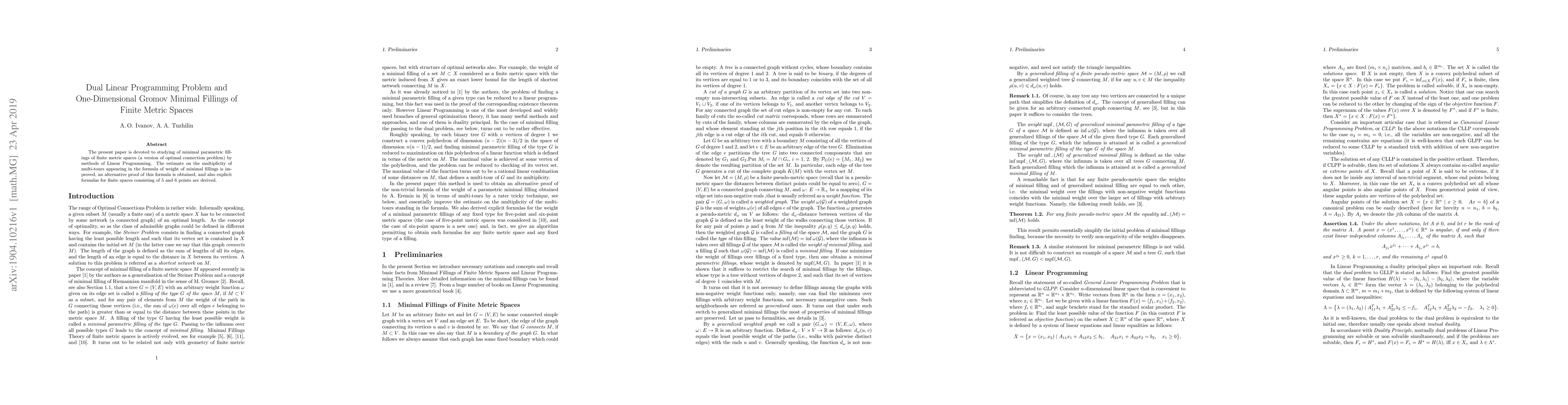 The present paper is devoted to studying of minimal parametric fillings of finite metric spaces (a version of optimal connection problem) by methods of Linear Programming. The estimate on the multiplicity of multi-tours appearing in the formula of weight of minimal fillings is improved, an alternative proof of this formula is obtained, and also explicit formulas for finite spaces consisting of $5$ and $6$ points are derived.