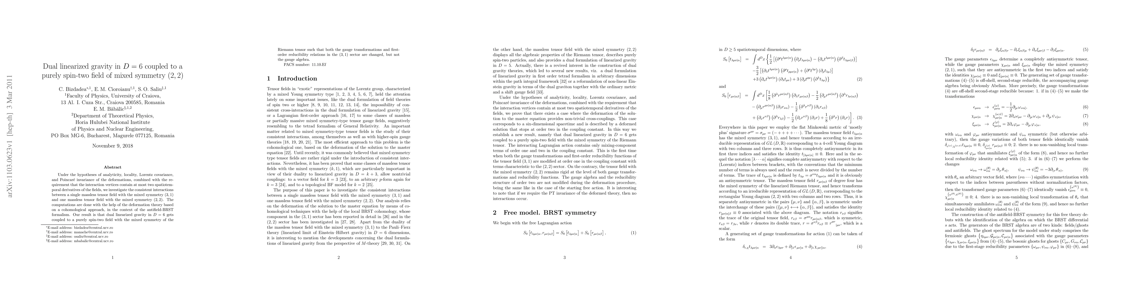 Under the hypotheses of analyticity, locality, Lorentz covariance, and Poincare invariance of the deformations, combined with the requirement that the interaction vertices contain at most two spatiotemporal derivatives of the fields, we investigate the consistent interactions between a single massless tensor field with the mixed symmetry (3,1) and one massless tensor field with the mixed symmetry (2,2). The computations are done with the help of the deformation theory based on a cohomological approach, in the context of the antifield-BRST formalism. Our result is that dual linearized gravity in D=6 gets coupled to a purely spin-two field with the mixed symmetry of the Riemann tensor such that both the gauge transformations and first-order reducibility relations in the (3,1) sector are changed, but not the gauge algebra.