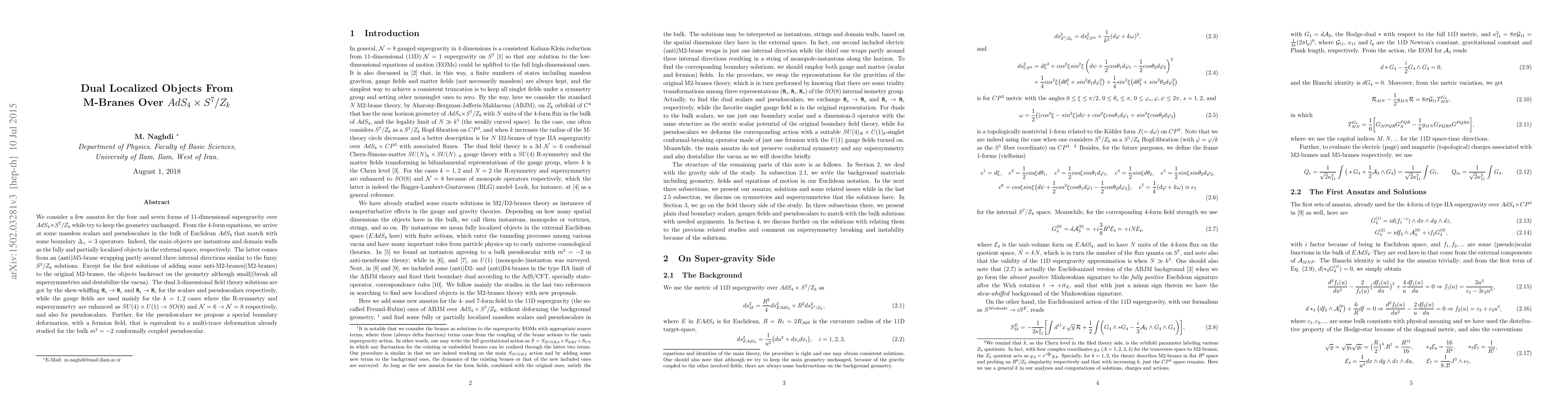 This paper explores ansatzs for the 4- and 7-forms in 11-dimensional supergravity over AdS_4 x S^7/Z_k, identifying instantons and domain walls as dual localized objects. The study reveals that the objects backreact slightly on the geometry, and dual 3-dimensional field theories are derived through specific transformations, with enhanced R-symmetry and supersymmetry for k=1,2 cases.