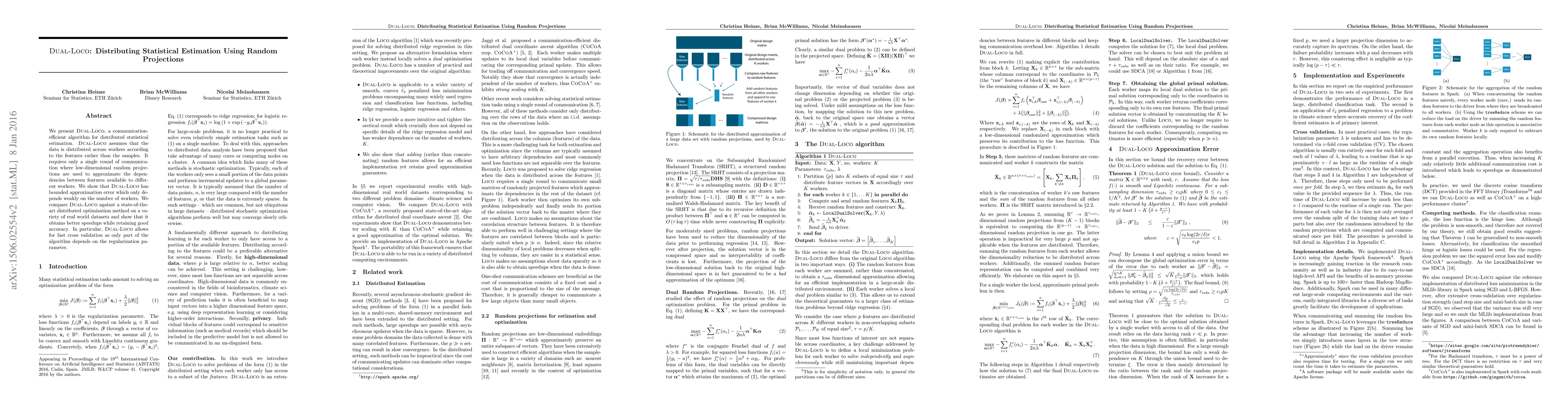 DUAL-LOCO is a communication-efficient algorithm for distributed statistical estimation that uses low-dimensional random projections for a single round of communication. It achieves better speedups and maintains accuracy compared to state-of-the-art distributed optimization methods.