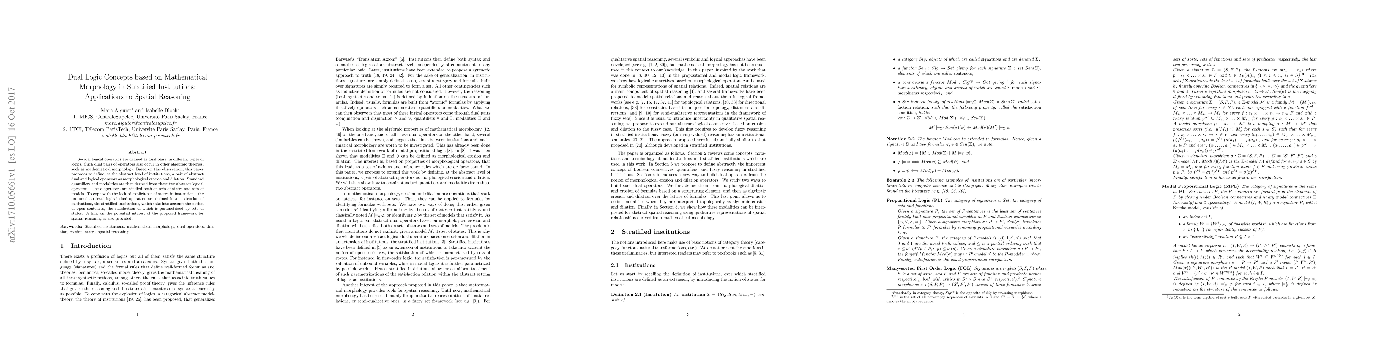 Several logical operators are defined as dual pairs, in different types of logics. Such dual pairs of operators also occur in other algebraic theories, such as mathematical morphology. Based on this observation, this paper proposes to define, at the abstract level of institutions, a pair of abstract dual and logical operators as morphological erosion and dilation. Standard quantifiers and modalities are then derived from these two abstract logical operators. These operators are studied both on sets of states and sets of models. To cope with the lack of explicit set of states in institutions, the proposed abstract logical dual operators are defined in an extension of institutions, the stratified institutions, which take into account the notion of open sentences, the satisfaction of which is parametrized by sets of states. A hint on the potential interest of the proposed framework for spatial reasoning is also provided.