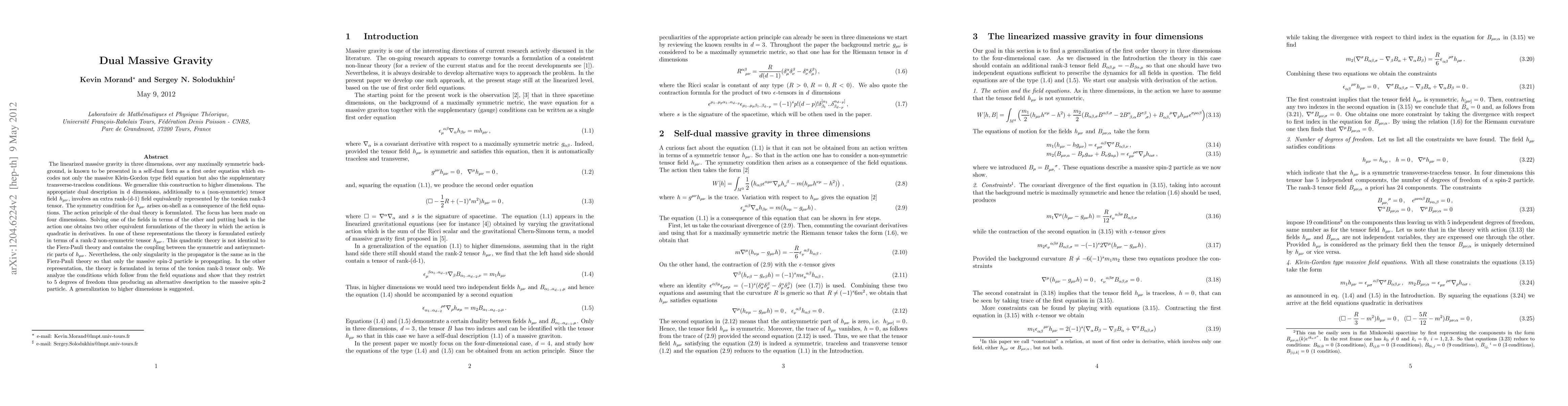 The linearized massive gravity in three dimensions, over any maximally symmetric background, is known to be presented in a self-dual form as a first order equation which encodes not only the massive Klein-Gordon type field equation but also the supplementary transverse-traceless conditions. We generalize this construction to higher dimensions. The appropriate dual description in d dimensions, additionally to a (non-symmetric) tensor field $h_{\mu\nu}$, involves an extra rank-(d-1) field equivalently represented by the torsion rank-3 tensor. The symmetry condition for $h_{\mu\nu}$ arises on-shell as a consequence of the field equations. The action principle of the dual theory is formulated. The focus has been made on four dimensions. Solving one of the fields in terms of the other and putting back in the action one obtains two other equivalent formulations of the theory in which the action is quadratic in derivatives. In one of these representations the theory is formulated entirely in terms of a rank-2 non-symmetric tensor $h_{\mu\nu}$. This quadratic theory is not identical to the Fierz-Pauli theory and contains the coupling between the symmetric and antisymmetric parts of $h_{\mu\nu}$. Nevertheless, the only singularity in the propagator is the same as in the Fierz-Pauli theory so that only the massive spin-2 particle is propagating. In the other representation, the theory is formulated in terms of the torsion rank-3 tensor only. We analyze the conditions which follow from the field equations and show that they restrict to 5 degrees of freedom thus producing an alternative description to the massive spin-2 particle. A generalization to higher dimensions is suggested.
