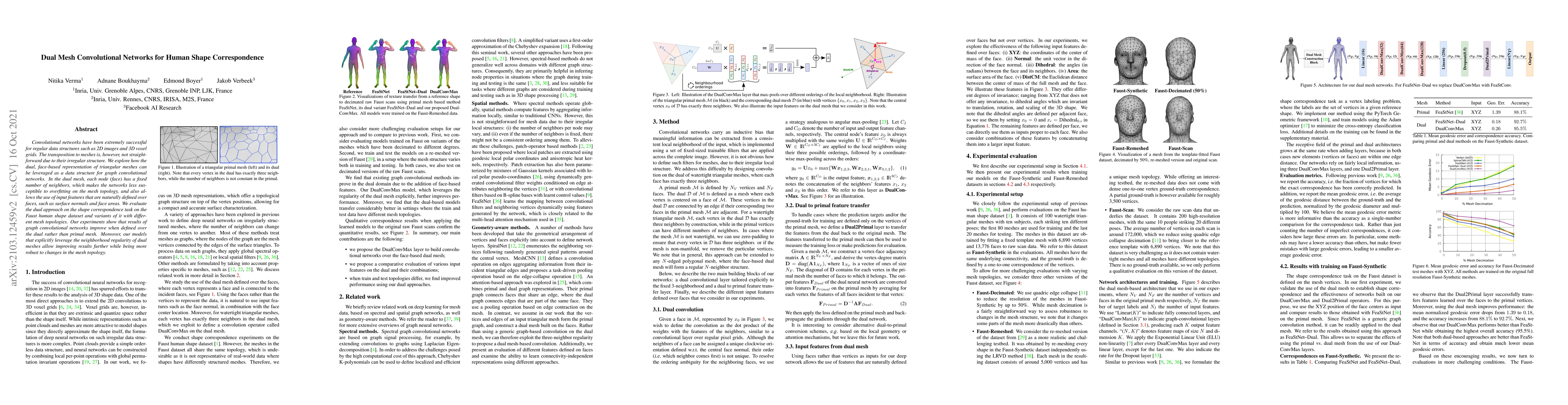 This paper proposes using dual mesh representations for graph convolutional networks to improve human shape correspondence tasks. Experiments on the Faust dataset show that dual mesh convolutional networks outperform traditional primal mesh approaches, especially when leveraging the fixed neighborhood regularity of dual meshes.