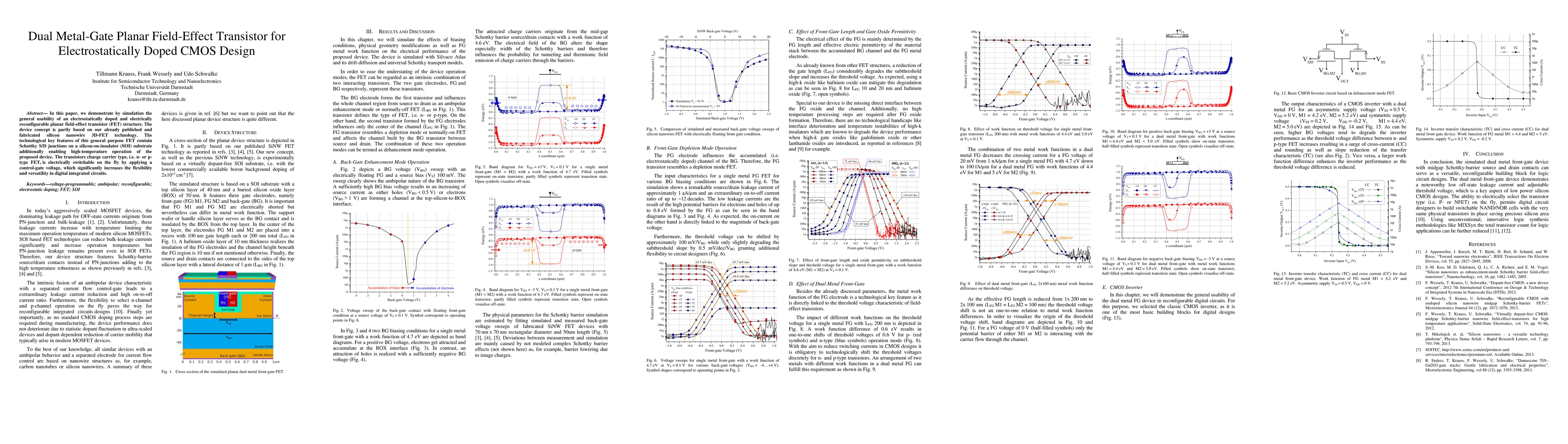 In this paper, we demonstrate by simulation the general usability of an electrostatically doped and electrically reconfigurable planar field-effect transistor (FET) structure. The device concept is partly based on our already published and fabricated silicon nanowire 3D-FET technology. The technological key features of this general purpose FET contain Schottky S/D junctions on a silicon-on-insulator (SOI) substrate additionally enabling high-temperature operation of the proposed device. The transistors charge carrier type, i.e. n- or ptype FET, is electrically switchable on the fly by applying a control-gate voltage, which significantly increases the flexibility and versatility in digital integrated circuits.