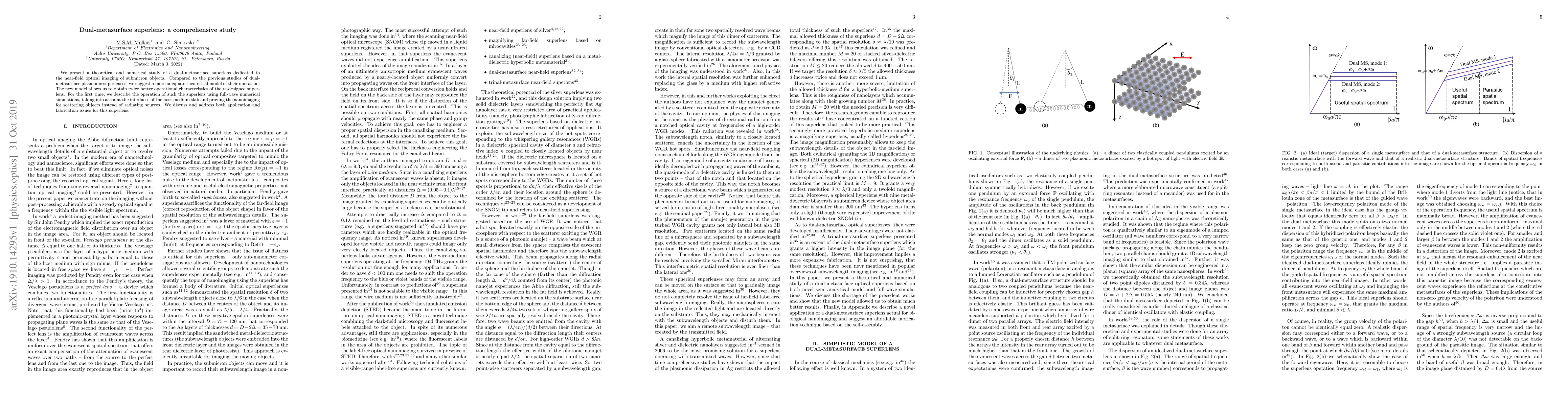 This paper presents a theoretical and numerical study of a dual metasurface superlens designed for near-field optical imaging of submicron objects, proposing a more effective theoretical model that doubles the operational characteristics compared to previous studies. The study includes full-wave numerical simulations addressing scattering objects and discusses both applications and fabrication challenges.