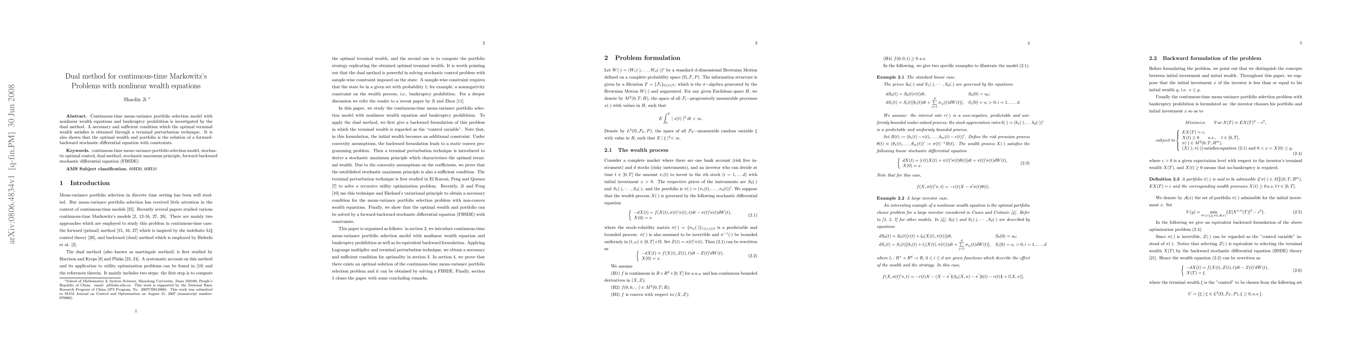 Continuous-time mean-variance portfolio selection model with nonlinear wealth equations and bankruptcy prohibition is investigated by the dual method. A necessary and sufficient condition which the optimal terminal wealth satisfies is obtained through a terminal perturbation technique. It is also shown that the optimal wealth and portfolio is the solution of a forward-backward stochastic differential equation with constraints.