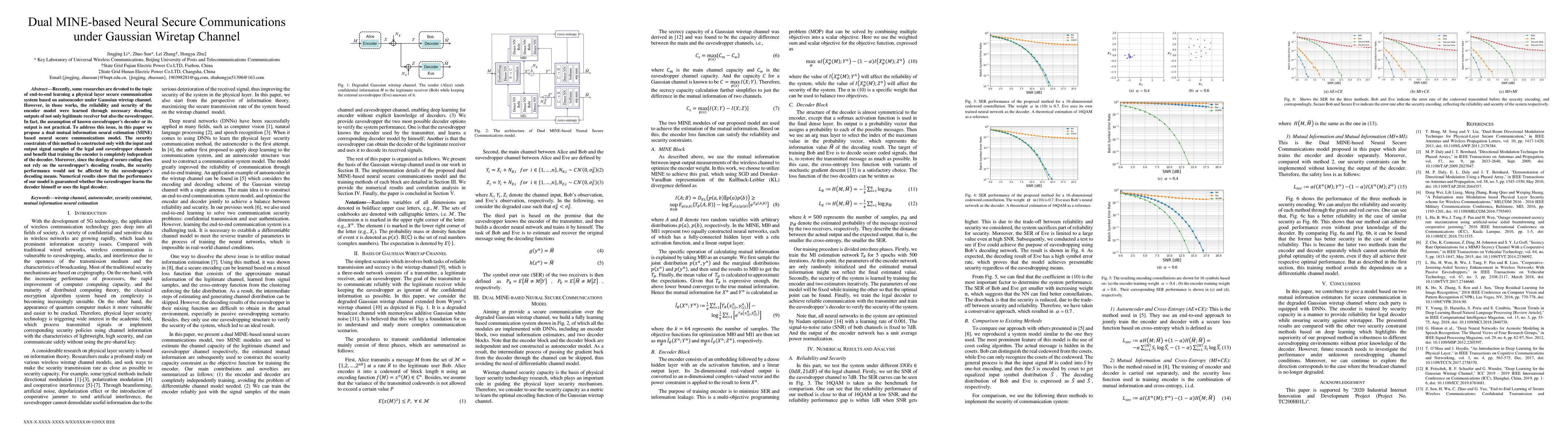 This paper proposes a dual MINE-based neural secure communication model for Gaussian wiretap channels, ensuring security and reliability without relying on the eavesdropper's decoding outputs. The model trains the encoder independently, maintaining security performance regardless of the eavesdropper's decoding methods.