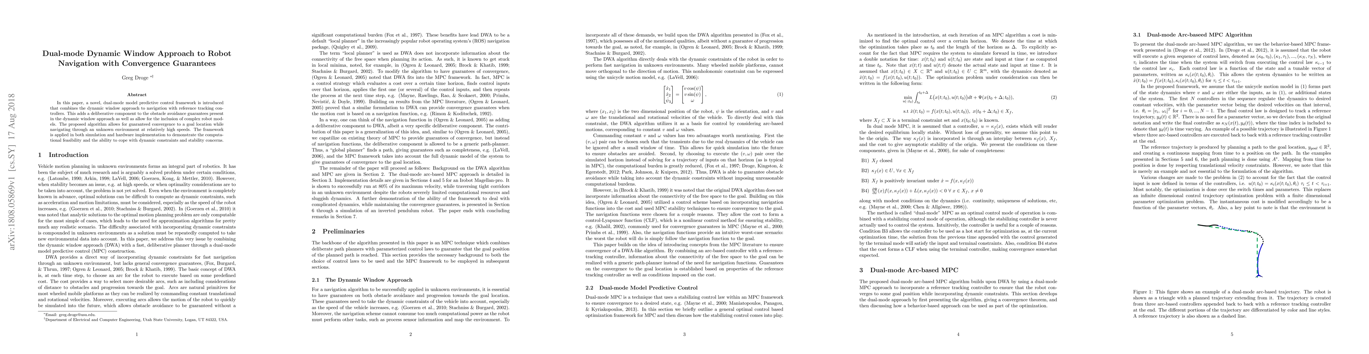In this paper, a novel, dual-mode model predictive control framework is introduced that combines the dynamic window approach to navigation with reference tracking controllers. This adds a deliberative component to the obstacle avoidance guarantees present in the dynamic window approach as well as allow for the inclusion of complex robot models. The proposed algorithm allows for guaranteed convergence to a goal location while navigating through an unknown environment at relatively high speeds. The framework is applied in both simulation and hardware implementation to demonstrate the computational feasibility and the ability to cope with dynamic constraints and stability concerns.