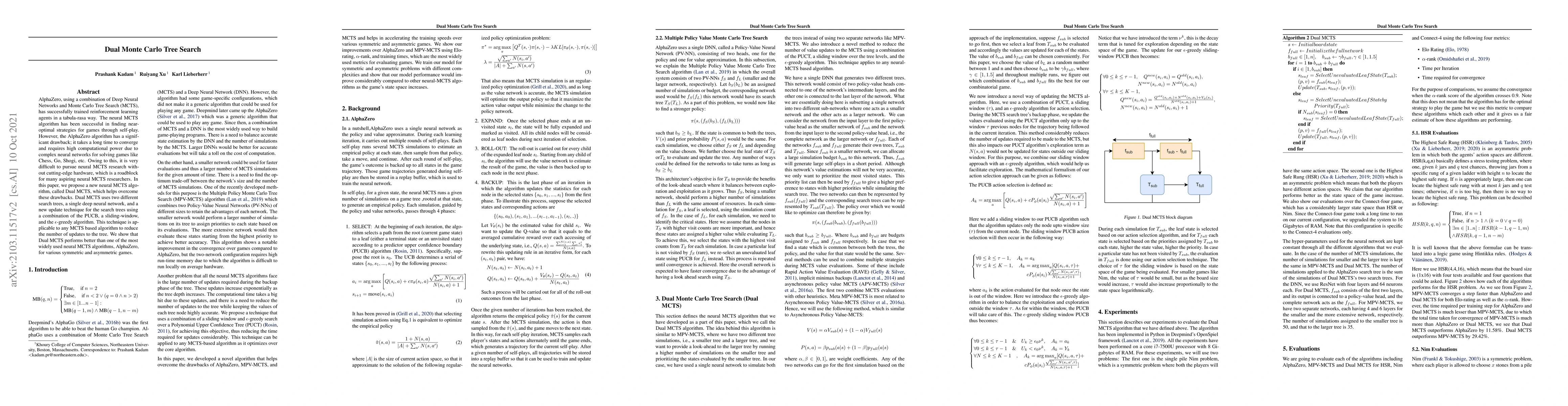 This paper proposes Dual Monte Carlo Tree Search (MCTS), a new neural MCTS algorithm that employs two search trees and a novel update technique to reduce computational demands and improve convergence speed compared to AlphaZero. The results show that Dual MCTS outperforms AlphaZero in various game scenarios.