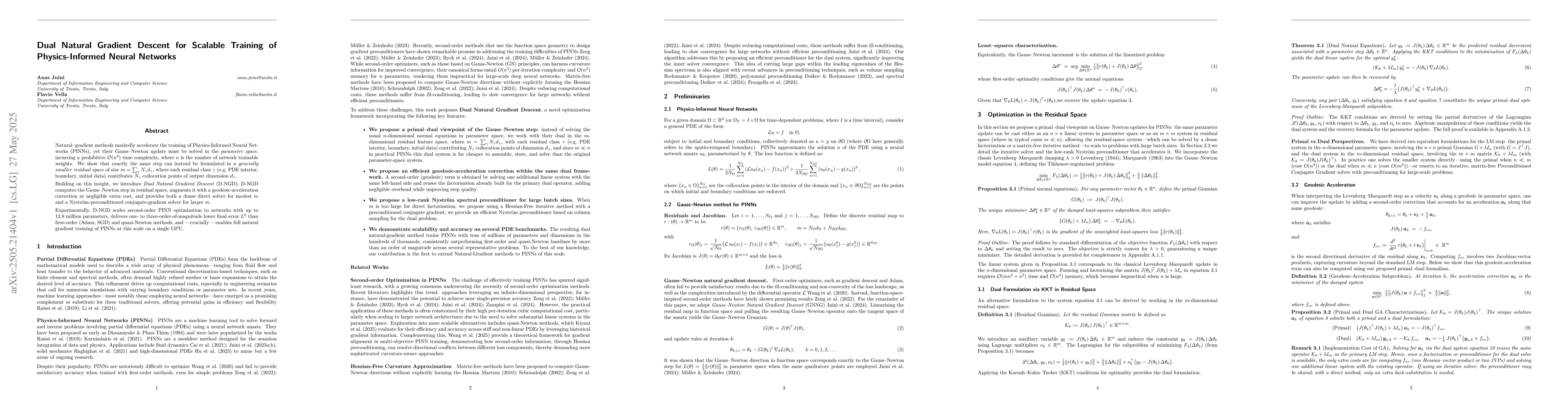 Researchers introduce Dual Natural Gradient Descent (D-NGD), a scalable method for training Physics-Informed Neural Networks (PINNs) on large datasets, reducing final error by one to three orders of magnitude compared to existing methods.